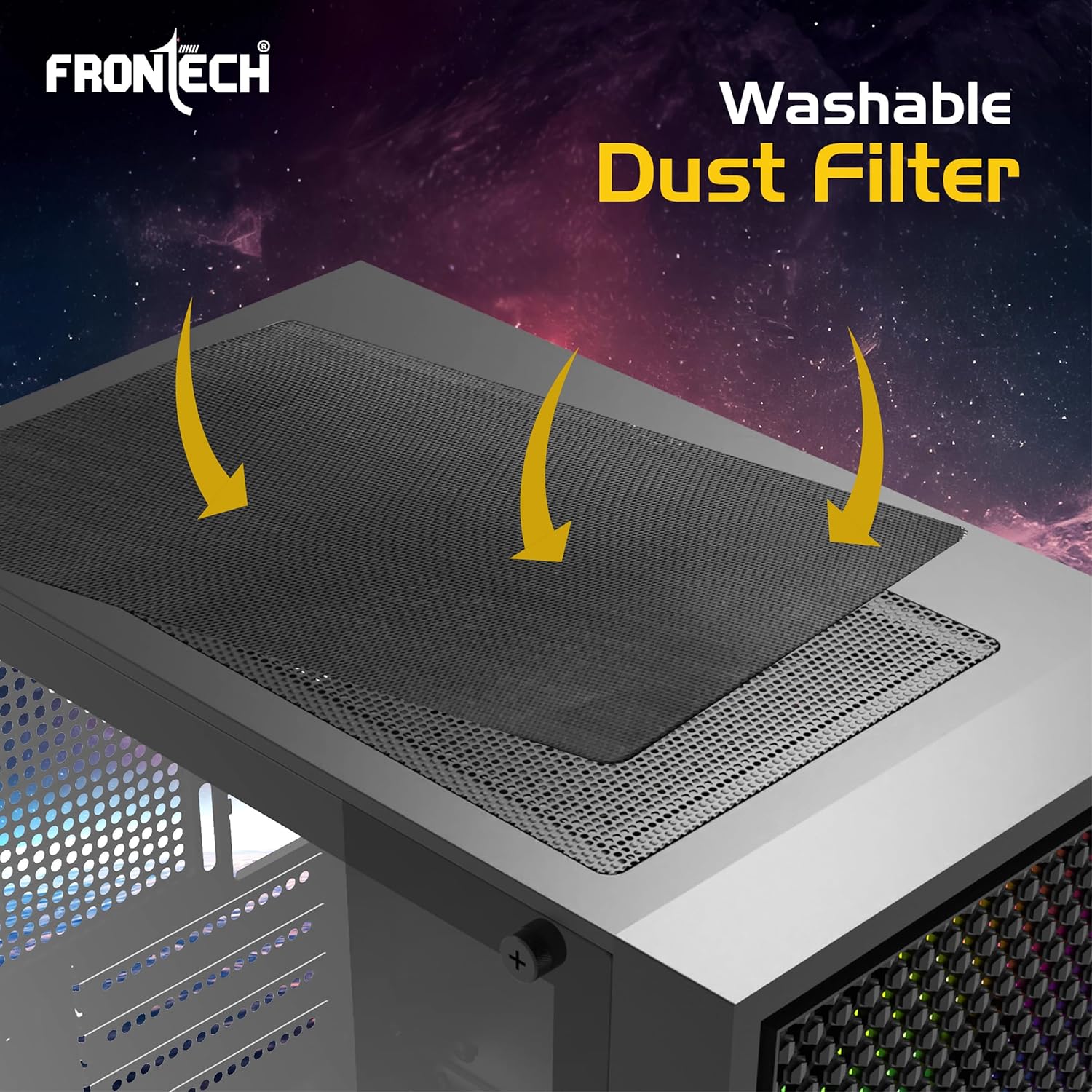 Front I/O with USB 3.0, USB 2.0, audio & mic ports, washable dust filter