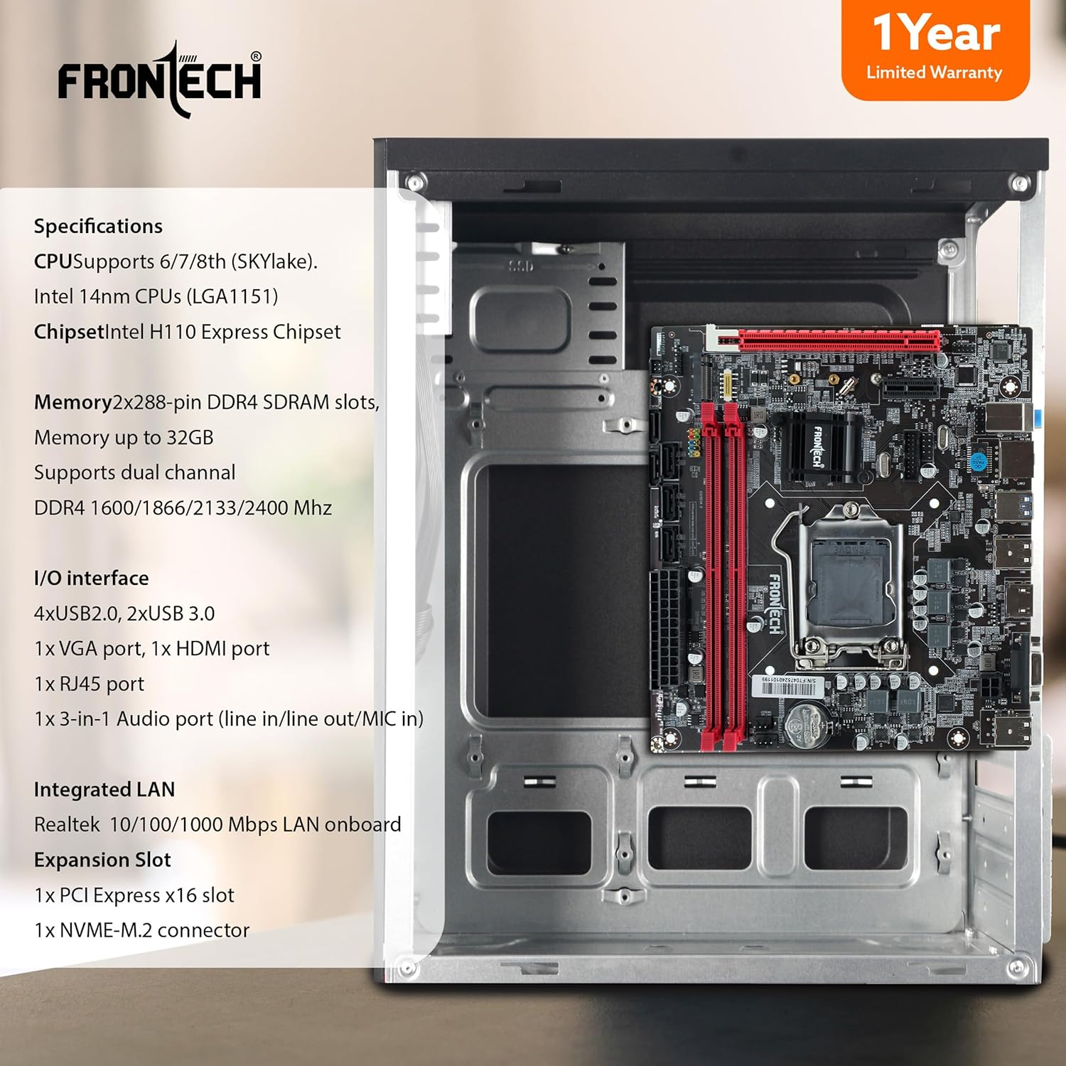 FRONTECH H110 Chipset Motherboard with 2xDDR4 RAM Slots LGA1151 Supports 6/7/8th (SKYlake), 14nm CPUs Processors | 2xUSB 3.0, 4xUSB 2.0 | 4xSATA Slots | NVME Slots, 1xPCIEX16, 1xHDMI, 1xVGA (FT-0475)