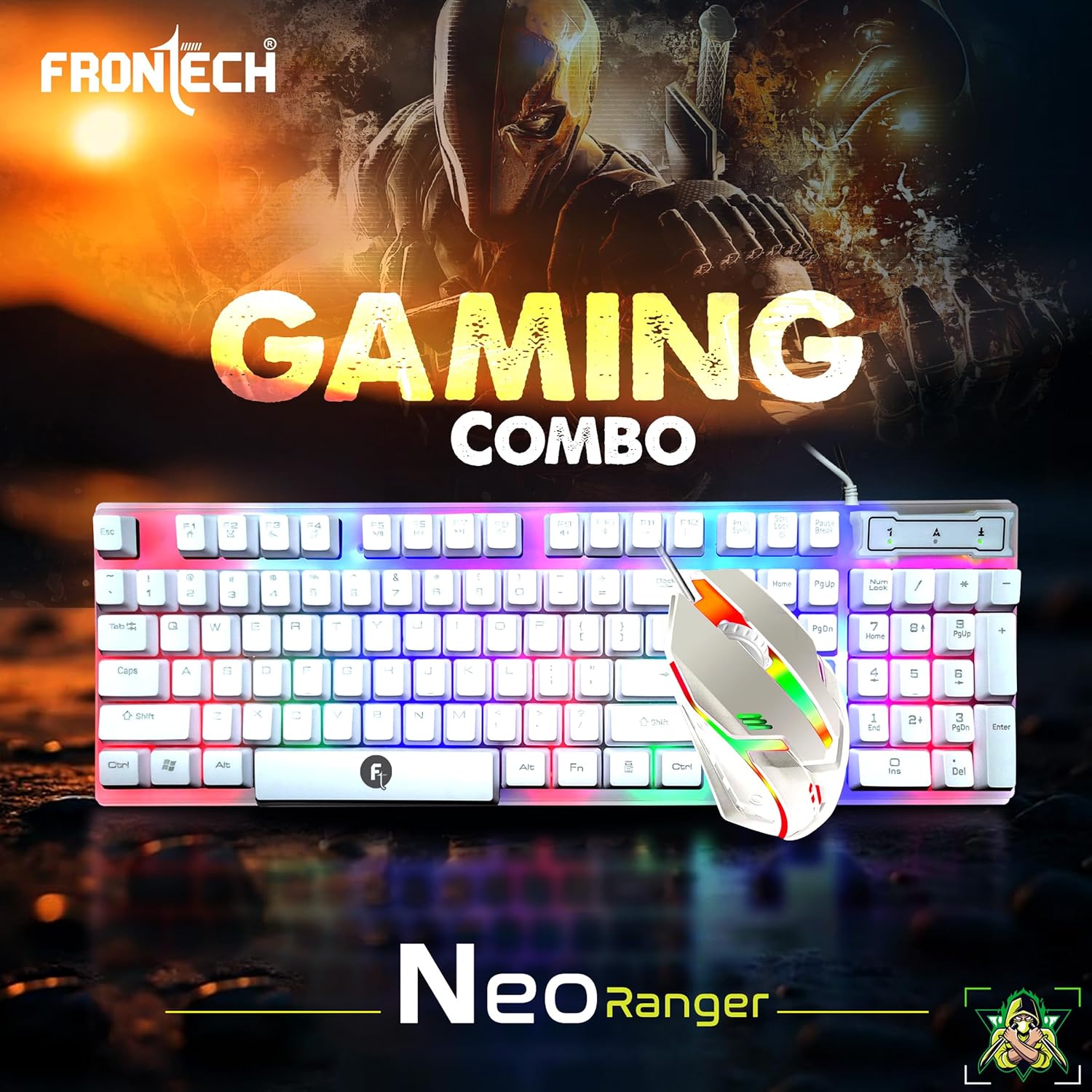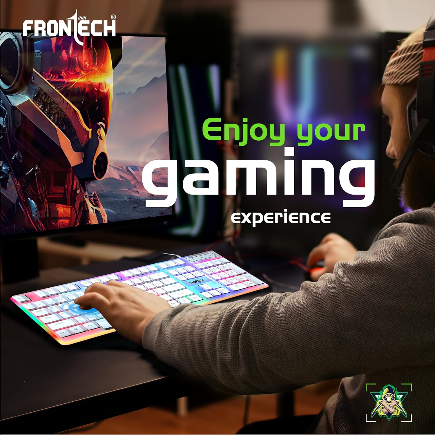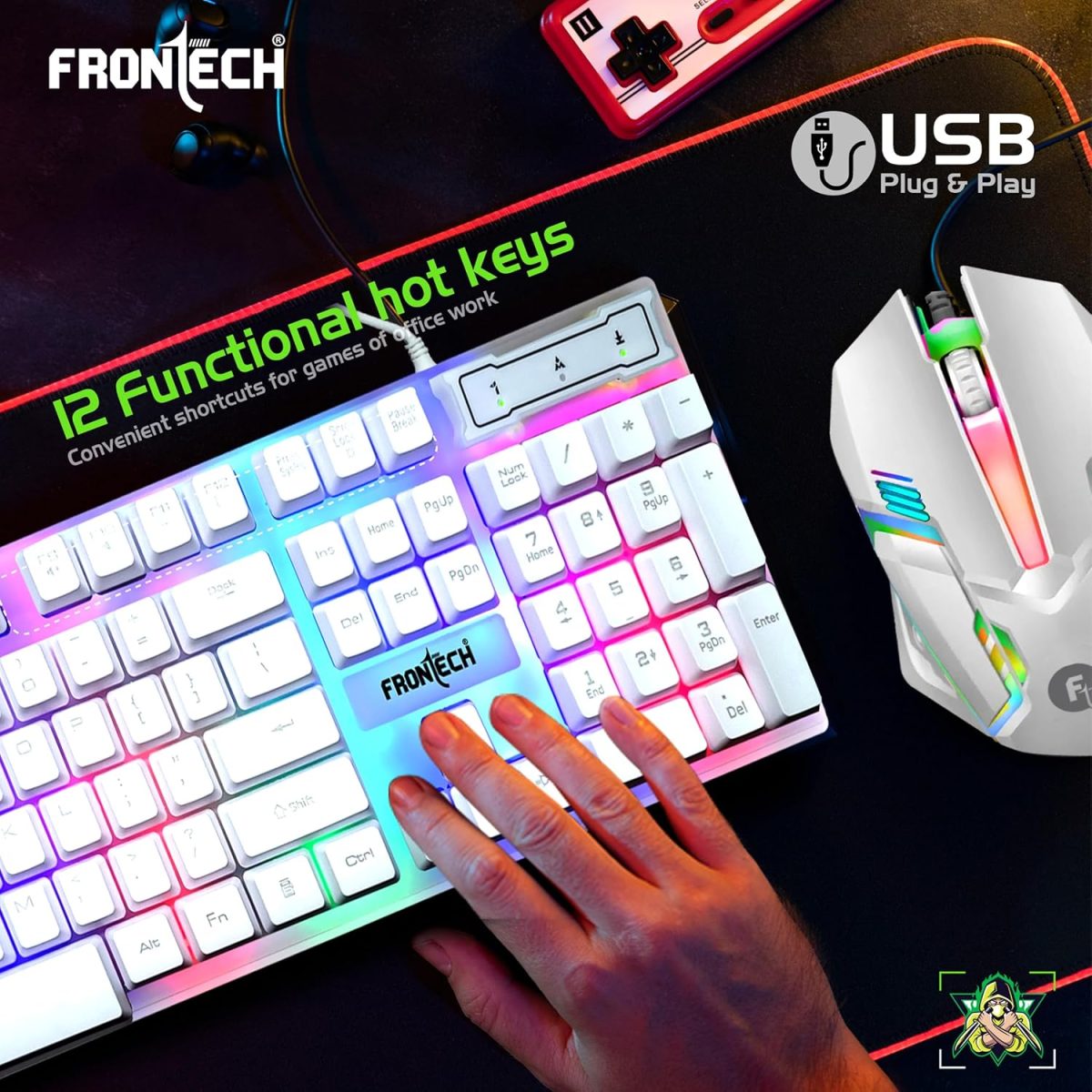 The FRONTECH KB-0040PW Wired Gaming Keyboard and Mouse Combo is a complete USB Plug & Play solution for gamers, students, and office users. It includes a full-size 105-key wired keyboard and a 1200 DPI optical mouse for fast, accurate performance. Ideal for desktop PCs, laptops, and Windows 11/10/8/7/XP systems, this combo offers ergonomic comfort, smooth typing, precise tracking, and a stylish white finish—perfect for gaming, work-from-home, online classes, and everyday use.