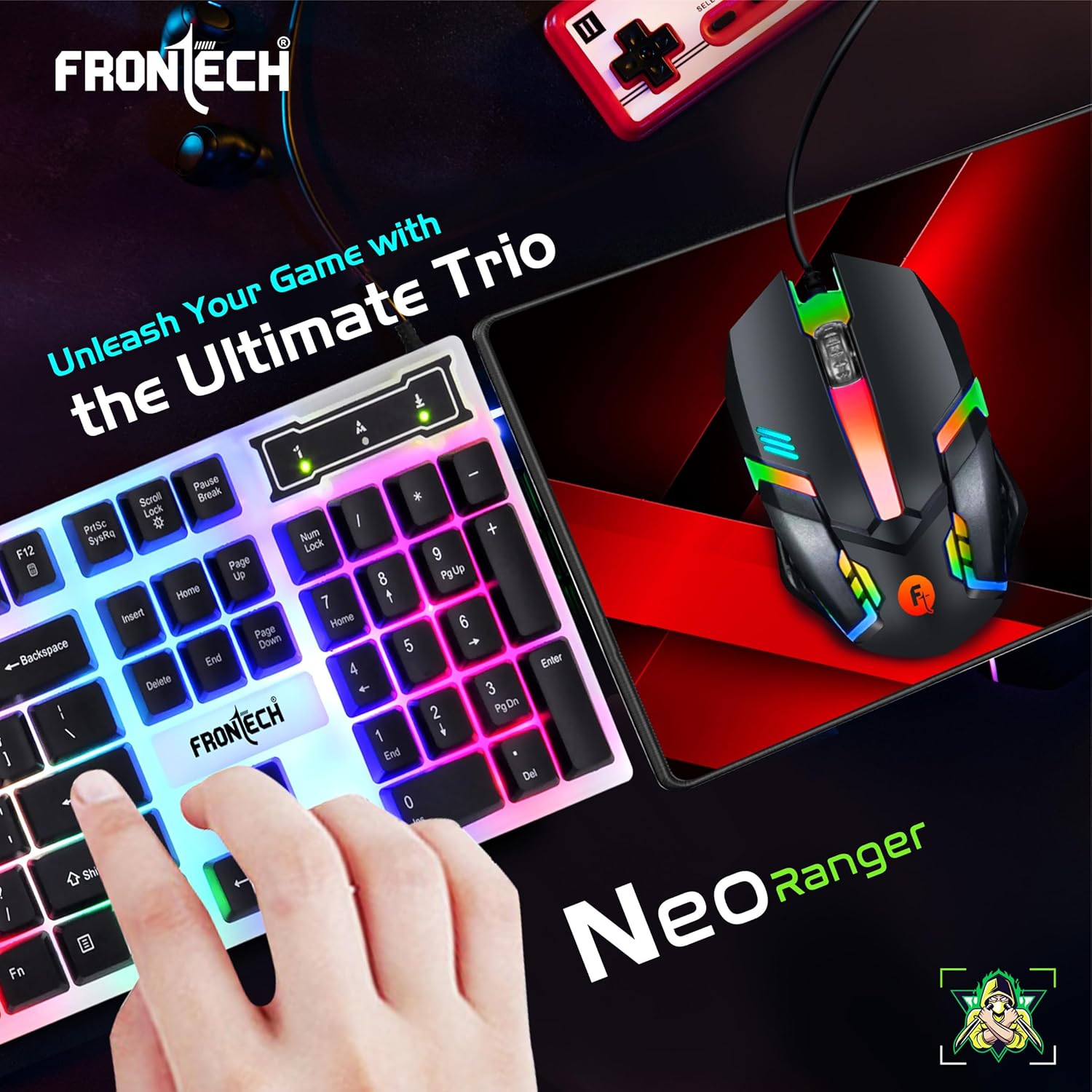 Frontech Neo Ranger 3-in-1 Gaming Combo – RGB LED Backlit 104-Key Keyboard, 1200 DPI Optical Mouse & Anti-Skid Mouse Pad – USB Wired (KB-0040PC)