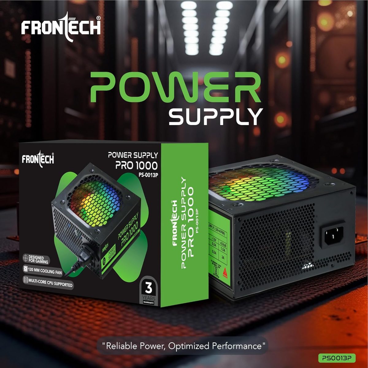 The Frontech PRO 1000 (PS-0013P) Power Supply is designed for gamers and PC enthusiasts, delivering stable and reliable performance with 600W output. It features a smart 120mm silent cooling fan with multicolour LED, ATX 12V compatibility, and essential protections like OCP, OVP, and SCP. With high-quality cables and multiple connectors, it ensures seamless support for modern gaming setups.