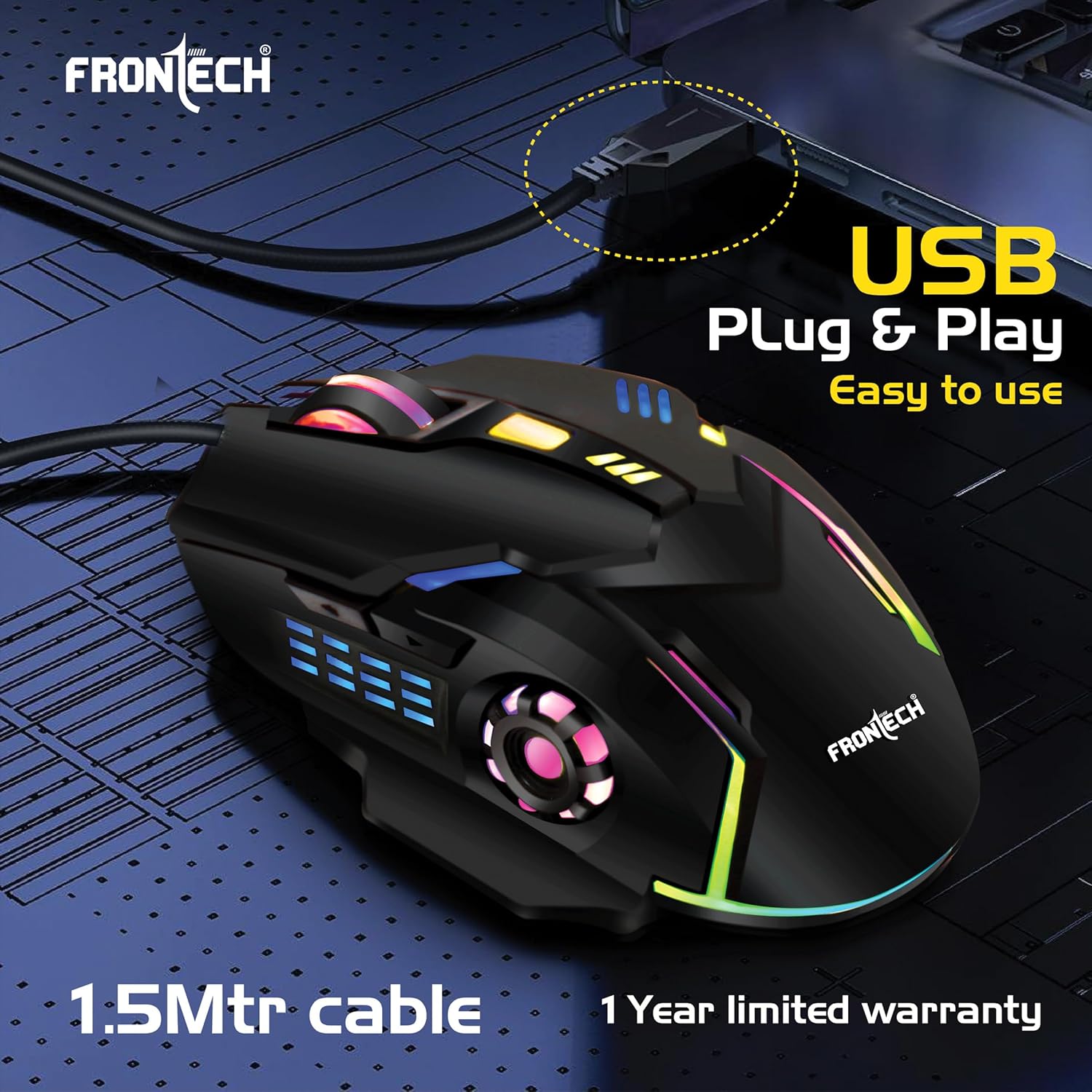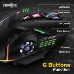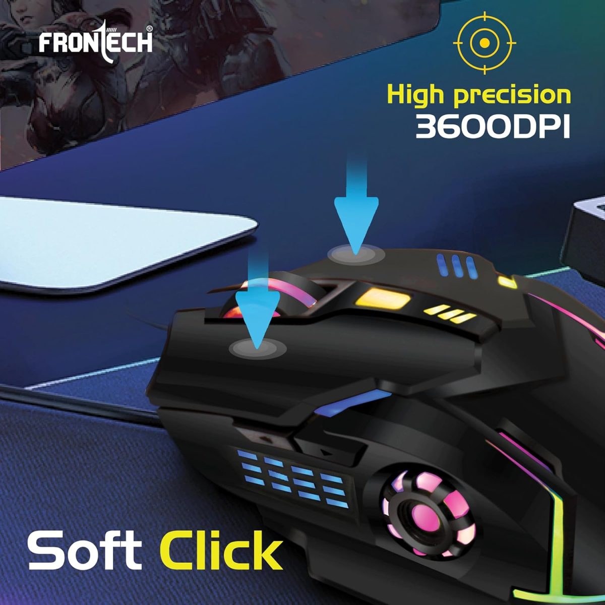 FRONTECH Wired Gaming Mouse, 6 Key RGB Backlit Effect| 7 LED Lighting| USB Plug & Play| 3600 DPI| for PC/Desktop/Mac/Laptop, 1-Year Warranty (MS-0050, Black)