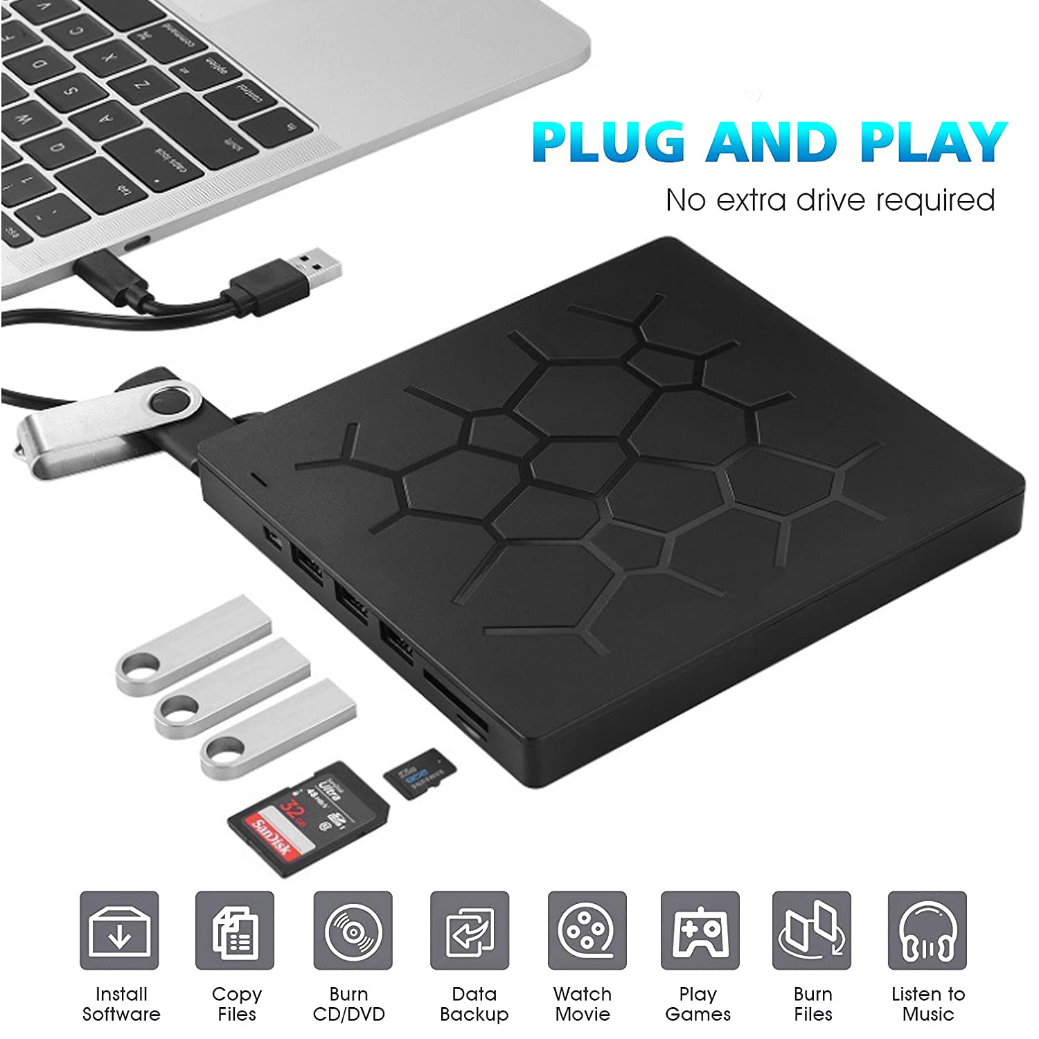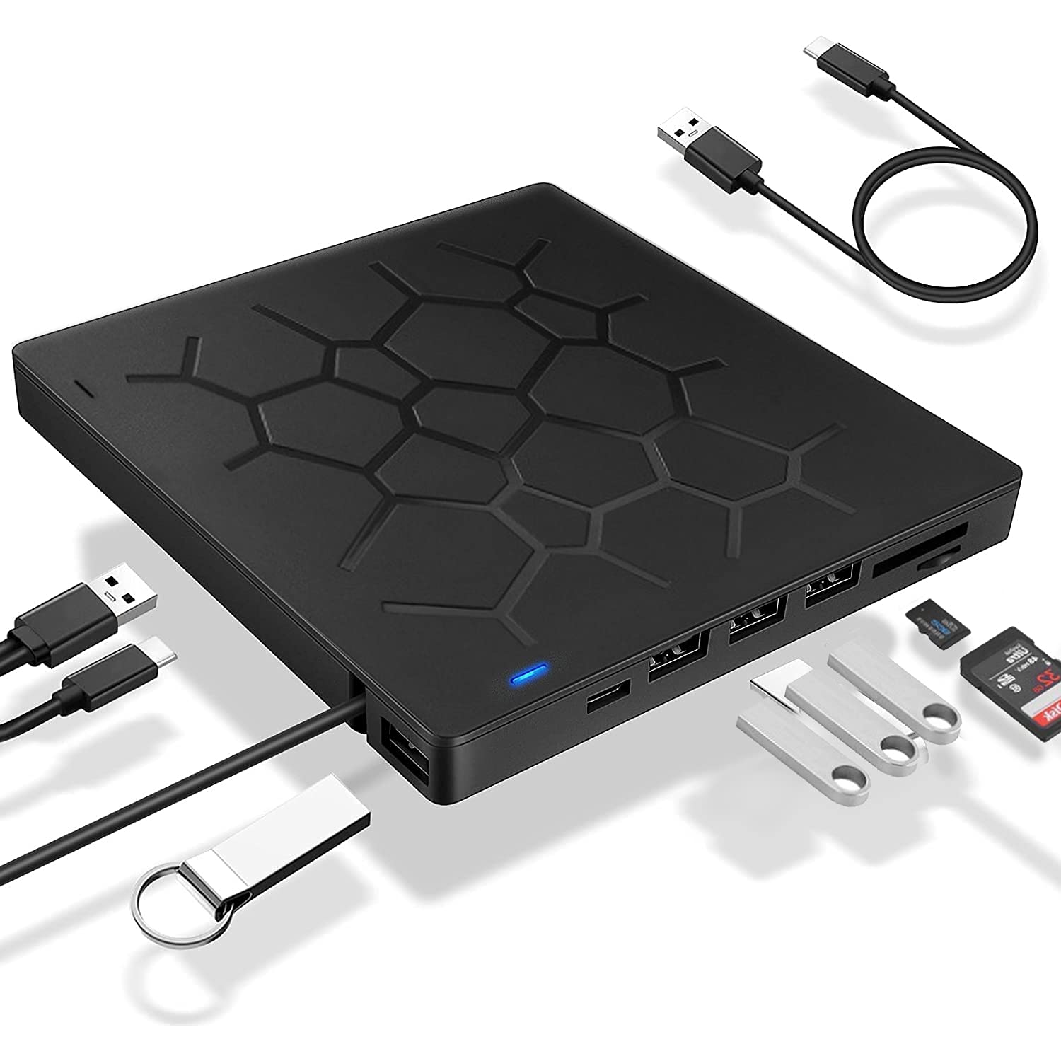 External DVD Drive, USB 3.0 CD DVD Burner for Laptop, Type-C CD/DVD ROM +/-RW Optical Disk Drive with 4 USB Ports and 2 SD Card Slots, Ultra Slim, for Mac, PC Windows 11/10/8/7 Linux OS