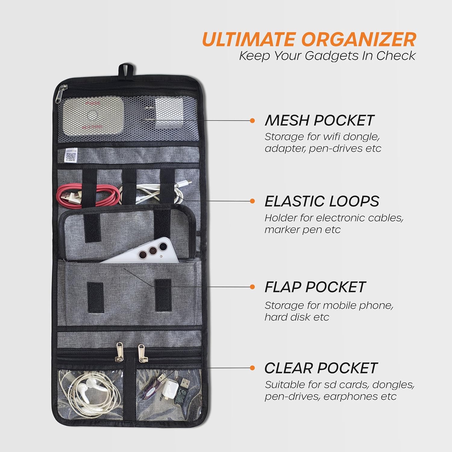 Multiple Storage Options: This travel organizer pouch features multiple compartments, including a mesh pocket for Wi-Fi dongles, adapters, and pen drives, elastic loops for cables and marker pens, a flap pocket for mobile phones, hard disks, and power banks, and a clear pocket for SD cards, earphones, and more.