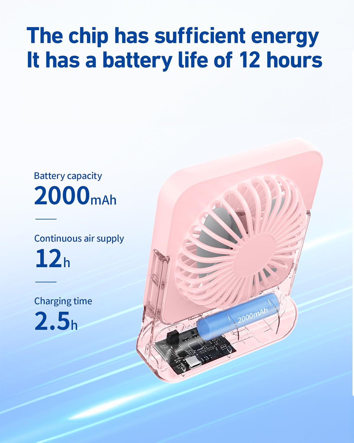 3 Speeds Table Fan – Customise your comfort with three different wind speeds. Whether you prefer a gentle breeze or powerful gusts, this fan offers gears.The 2000 mAh mini handheld fan can be used for 3-7 hours on a 2.5 hour charge for a long-lasting battery life that eliminates the need for frequent charging.
