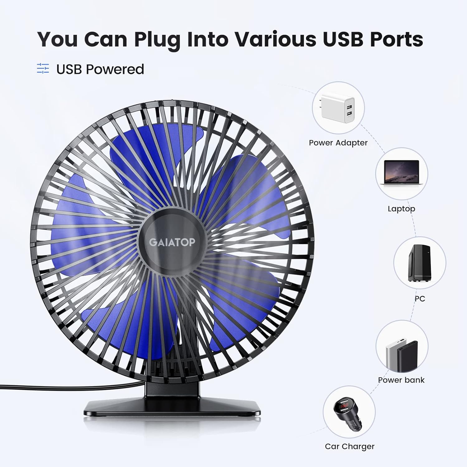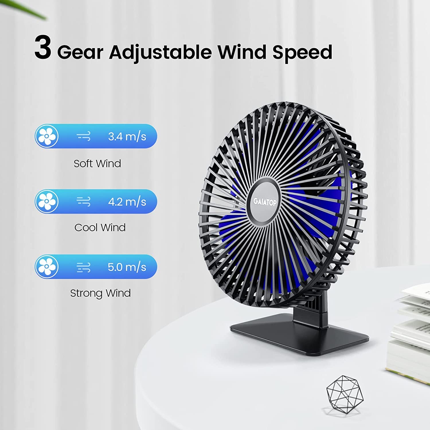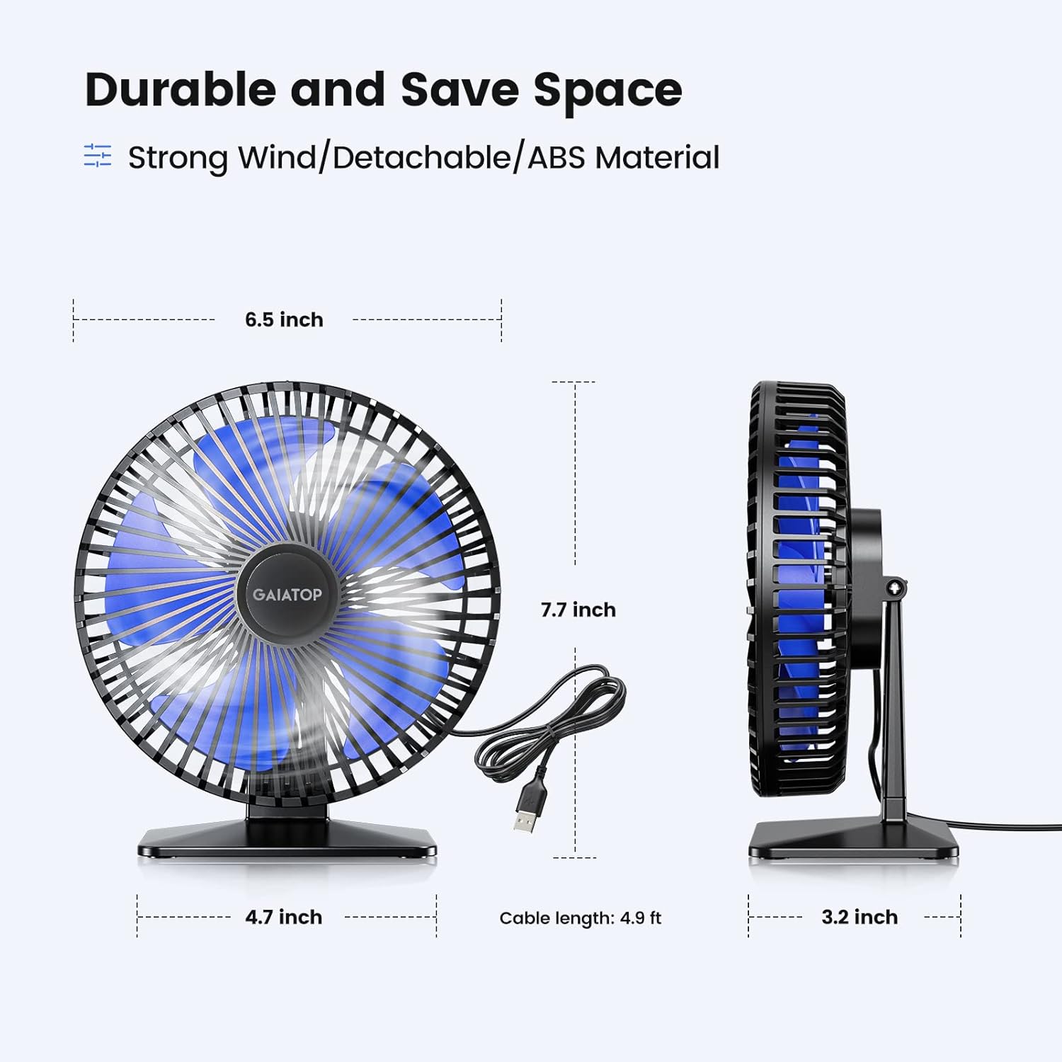 【Powerful USB Fan】5.5 Inch blade and 6.5 inch frame. It have bigger fan blade compared to other usb fans, the fan pushes packs a huger punch and cools you down more quickly, super strong wind speed can reach 5.3 m/s. This USB fan is detachable, easy to install and easy to carry. It is very suitable for desk, home, study, office, outside or traveling. Gaiatop table fan will give you a cool living environment.
