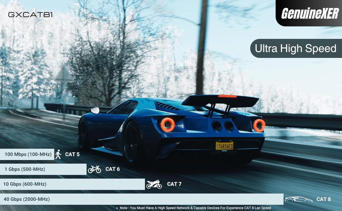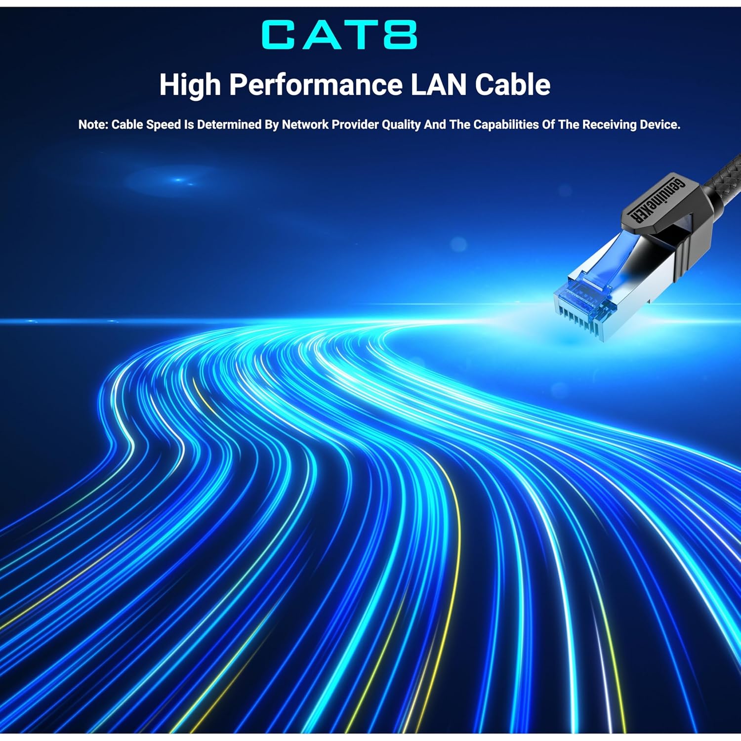 Unmatched Speed: With up to 40 Gbps speed, GenuineXER Cat 8 ensures lag-free gaming, far outperforming Cat 5 (100 Mbps), Cat 6 (1 Gbps), and Cat 7 (10 Gbps).Low Latency: Its high frequency of 2000 MHz reduces latency, delivering real-time responsiveness critical for competitive gaming.Stable Connection: Double shielding minimizes electromagnetic interference (EMI), providing a more stable and consistent connection than older cables.Future-Proofing: Cat 8 supports ultra-high-speed internet plans and next-gen gaming consoles, ensuring compatibility with upcoming technologies.Durability: The nylon-braided, double-shielded design of GenuineXER Cat 8 withstands wear and tear, ideal for frequent setups or gaming rigs.Enhanced Streaming: Perfect for 4K/8K game streaming, Cat 8 handles high bandwidth demands without buffering or dropped frames.Short-Distance Performance: Cat 8 maintains peak performance over shorter distances, ideal for gaming setups where stability matters most.Ultimate Gaming Edge: GenuineXER Cat 8 provides faster, more reliable, and interference-free gaming compared to Cat 5, Cat 6, or Cat 7.