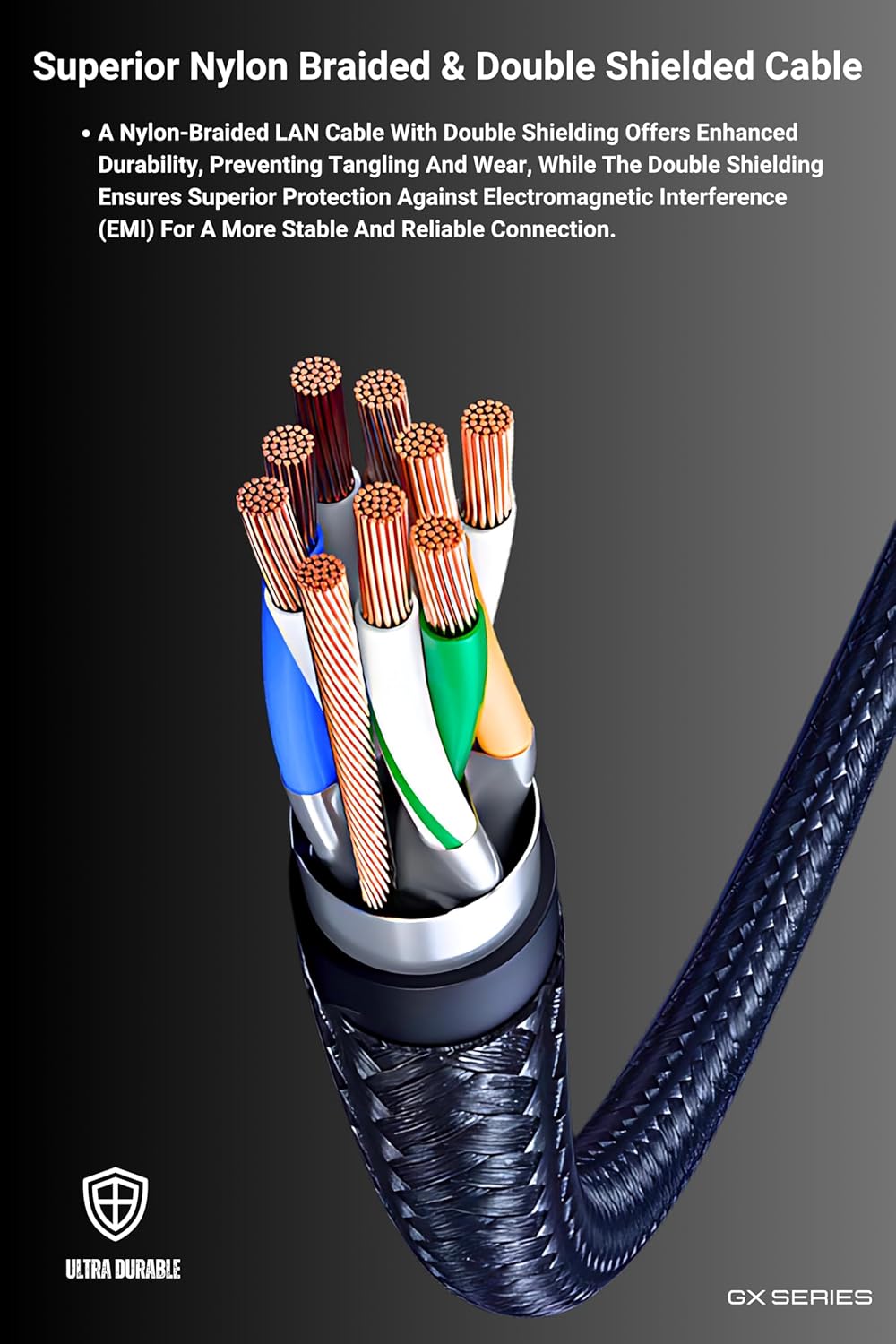 Durable Nylon Braided Design Built With A Premium Nylon-Braided Exterior, This LAN Cable Is Highly Resistant To Wear And Tear. It Offers Superior Flexibility While Preventing Tangles, Making It Ideal For Both Indoor And Outdoor Setups. The Robust Construction Ensures Long-Lasting Durability Even In Heavy-Use Scenarios.