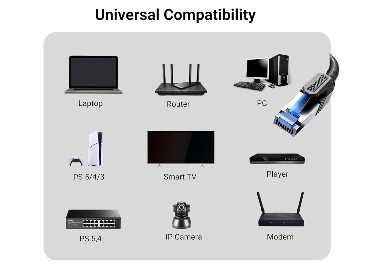 Blazing 40Gbps High Speed: Experience Ultra-Fast Data Transmission With Speeds Up To 40Gbps, Ideal For Gaming, Streaming, And High-Performance Networking.Unmatched 2000MHz Frequency: Supports A Bandwidth Of Up To 2000MHz, Ensuring Seamless Connectivity For Data-Intensive Tasks And Future-Ready Applications.Fluke-Tested Quality: Rigorously Fluke-Tested To Meet Industry Standards, Guaranteeing Reliability, Stability, And Top-Tier Performance.F/FTP Shielding For Security: Superior F/FTP Shielding Eliminates Interference, Delivering A Stable And Secure Connection Even In High-EMI Environments.30AWG Copper Core: Built With 30AWG Pure Copper For Exceptional Durability, Conductivity, And Long-Lasting Performance.Universal Compatibility: Fully Backward-Compatible With Cat 7, Cat 6a, Cat 6, And Cat 5e Devices, Making It Versatile For Home And Professional Networks.