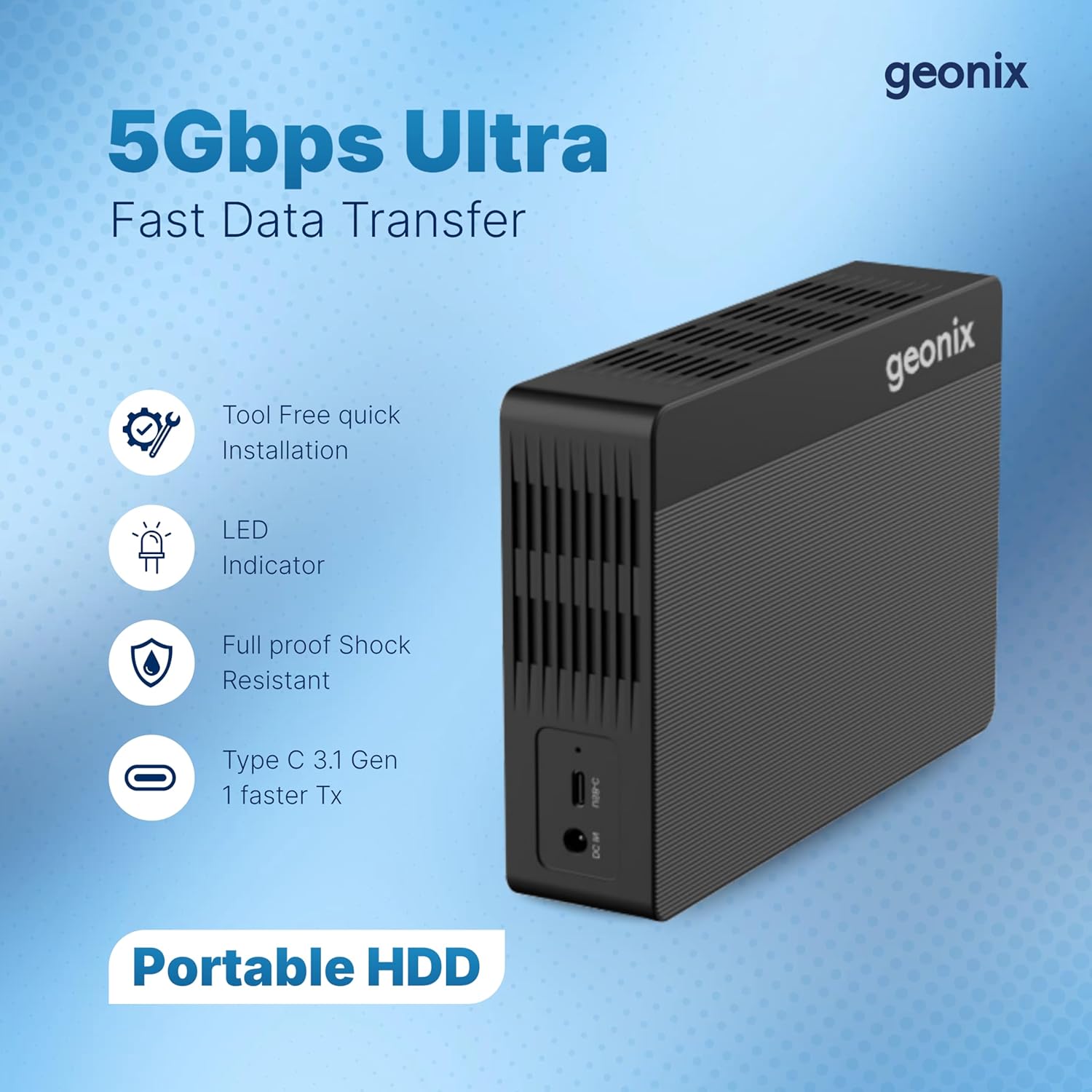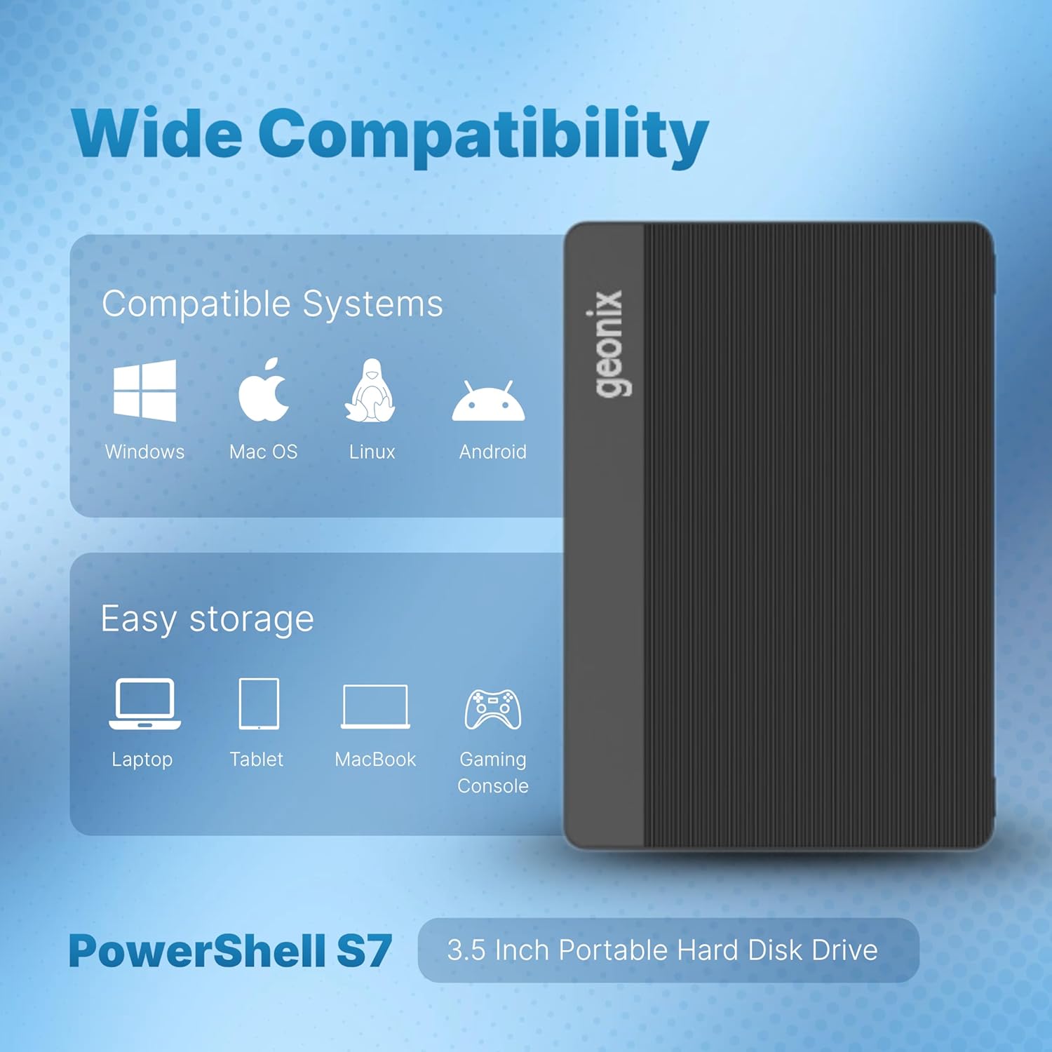 Introducing the GEONIX PowerShell S7 3TB External Hard Drive, your ideal companion for reliable, high-speed, and secure storage. This External Hard drive features a USB 3.1 interface with UASP (USB Attached SCSI Protocol) support, delivering ultra-fast data transfer speeds up to 5Gbps—perfect for handling large files, HD media, and system backups with ease. Designed for effortless use, it features tool-free installation and full plug-and-play compatibility with Windows, macOS, and Linux, requiring no drivers or additional setup. It’s perfect for use with desktops, laptops, tablets, Apple devices, and mobile phones. Internally, a shockproof cushioned sponge layer safeguards the hard disk from impact, making it suitable for on-the-go use. The built-in LED indicator flashes during data transfers, keeping you informed of operational status. Backed by high-performance JMS578 and RTL9201R chipsets, this HDD ensures stable performance and data security.