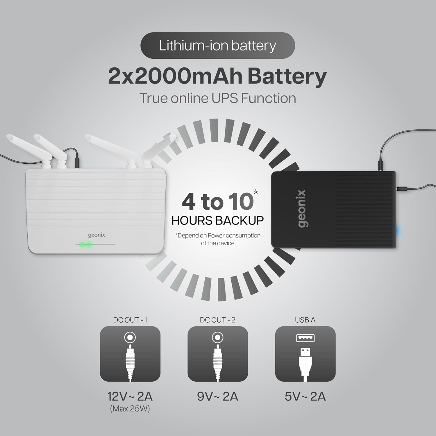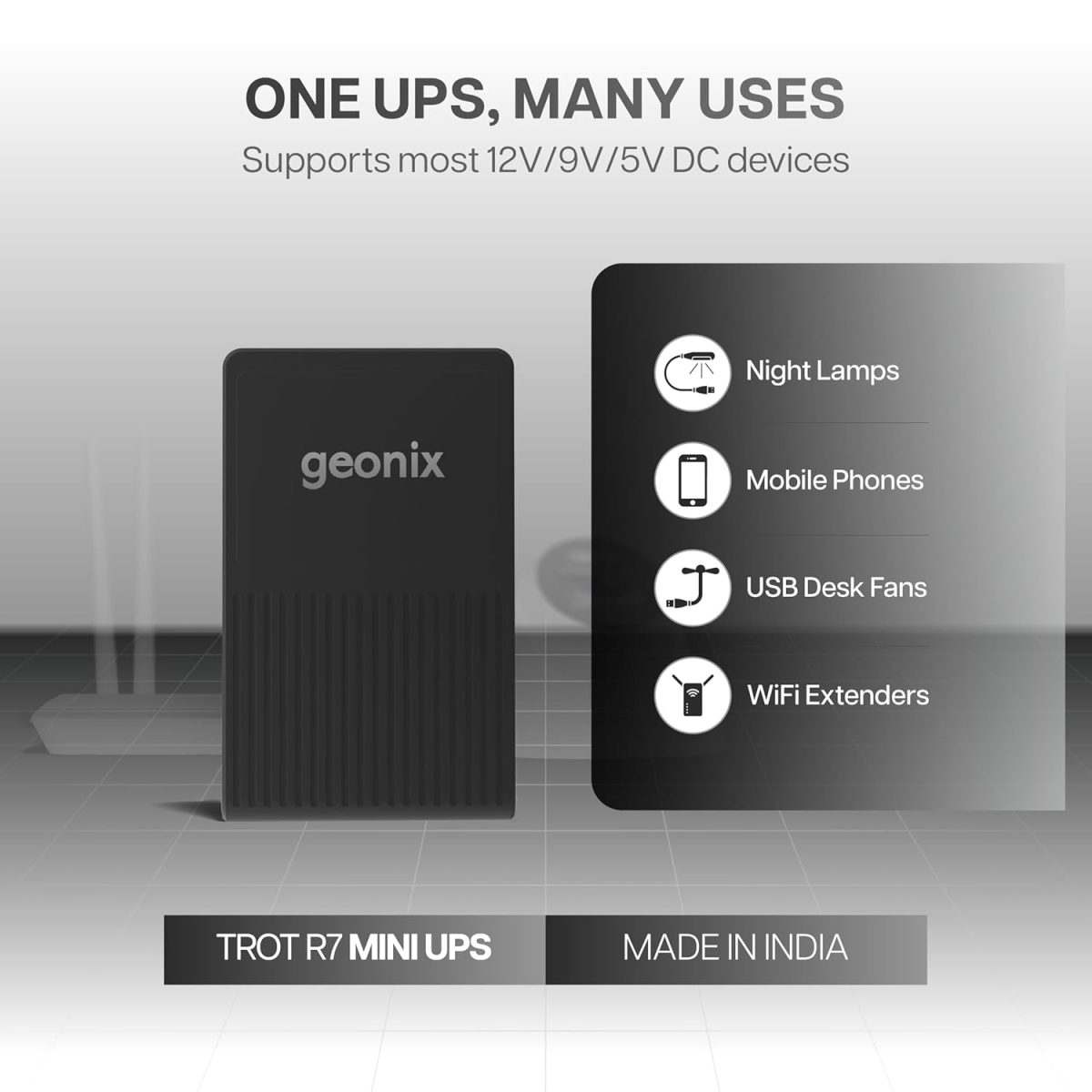 Geonix Trot R7 Mini UPS |Backup Upto 6 Hrs |2×2000 mAh Battery |Supports DC (12V/2A,9V/2A), USB (5V/2A) Output |Power Backup for Wi-Fi Routers, CCTV Camera, Cordless Phone, Modem (Black)