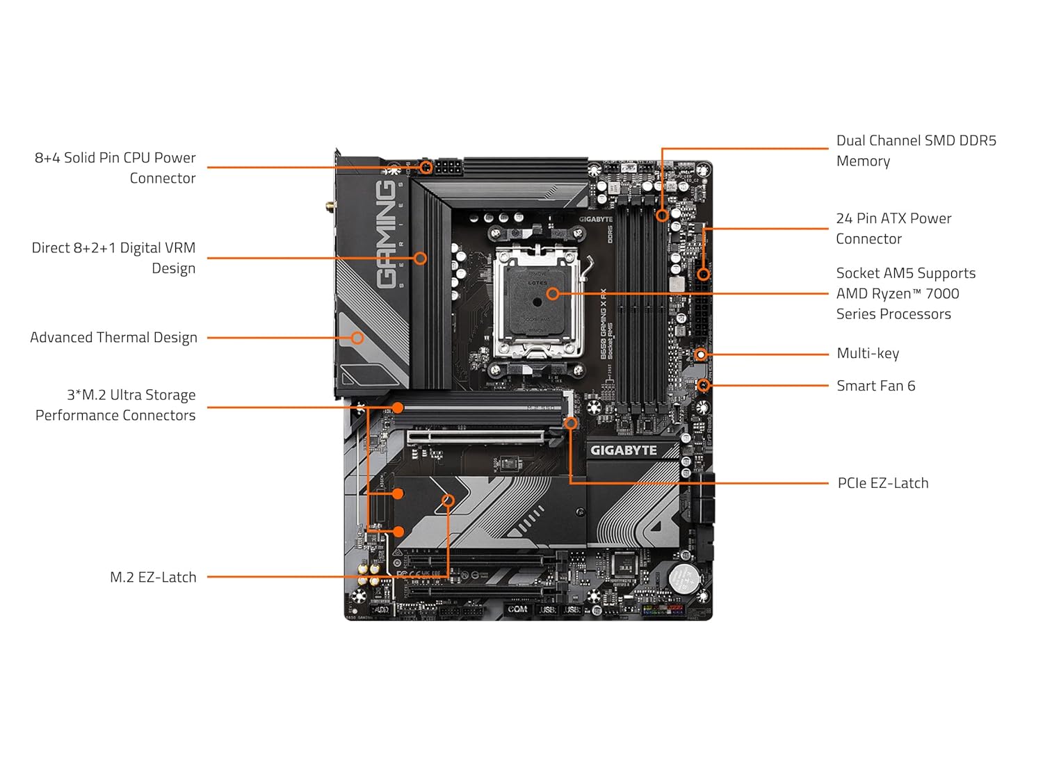 5-Year Warranty AMD AM5 Socket: Supports AMD Ryzen 7000 Series Processors DDR5 Compatible: 4*SMD DIMMs with AMD EXPO & Intel XMP Memory Module Support Unparalleled Performance: Direct 8+2+1 Phases Digital VRM Solution Advanced Thermal Design & M.2 Thermal Guard: To Ensure VRM Power Stability & M.2 SSD Performance Stable Connectivity: 3*PCIe 4.0 x4 M.2, USB 3.2 Gen 2×2 Type-C Fast Networking: 2.5GbE LAN, AMD Wi-Fi 6E Fine Tuning Features: RGB FUSION 2.0, Supports Addressable LED & RGB LED Strips, Smart Fan 6, Q-Flash Plus Update BIOS without installing, CPU, Memory, and GPUUnparalleled Performance:Direct 8+2+1 Phases Digital VRM Solution. A new era is here. The B650 GAMING X AX supports AM5 Processors and features unparalleled performance. GIGABYTE B650 motherboards come with upgraded power design, high grade storage standards, and outstanding connectivity that enables you to optimize your performance.