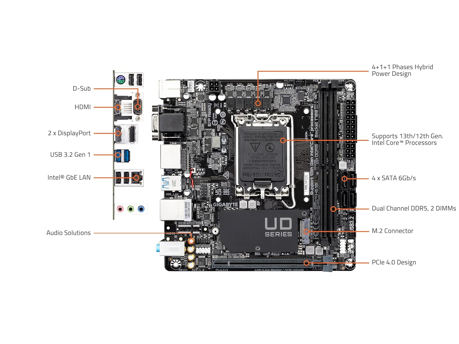 Supports Intel® Core™ 14th/ 13th /12th processors Dual Channel Non-ECC Unbuffered DDR4, 2 DIMMs 4+1+1 Hybrid Digital VRM Design Intel® GbE LAN with cFosSpeed Internet Accelerator Software NVMe PCIe 3.0 x4 M.2 High Quality Audio Capacitors and Audio Noise Guard Smart Fan 6 Features Multiple Temperature Sensors , Hybrid Fan Headers with FAN STOP GIGABYTE APP Center, Simple and Easy Use Anti-Sulfur Resistors Design