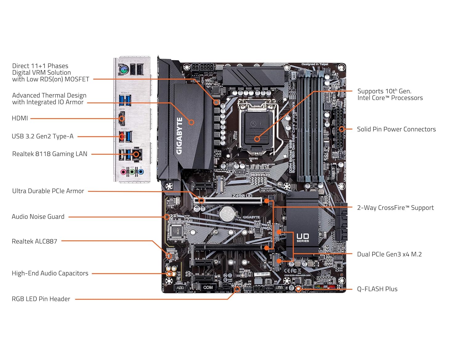 GIGABYTE Z490 UD motherboard comes with Enlarged VRM Heatsink with Increased Surface contact Air-Flow Grooving.Lightning-Fast Intel Thunderbolt 3 AIC Support.Smart Fan 5 Features Multiple Temperature Sensors , Hybrid Fan Headers with FAN STOP.Intel Native USB 3.2 Gen2 Type-A with Speed Up To 10Gbps.