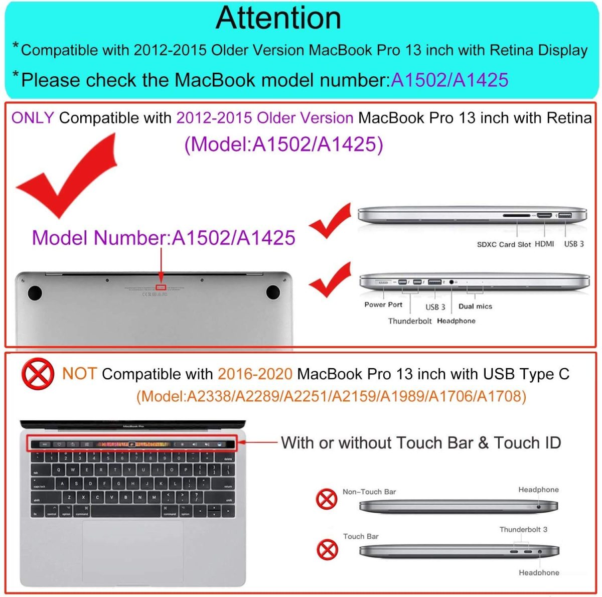 The case was designed ONLY to be compatible with Older Version MacBook Pro Retina 13 Inch (Models: A1502 & A1425), Release 2015 / 2014 / 2013 / end 2012. WARNING: This case is NOT compatible with other model MacBooks.