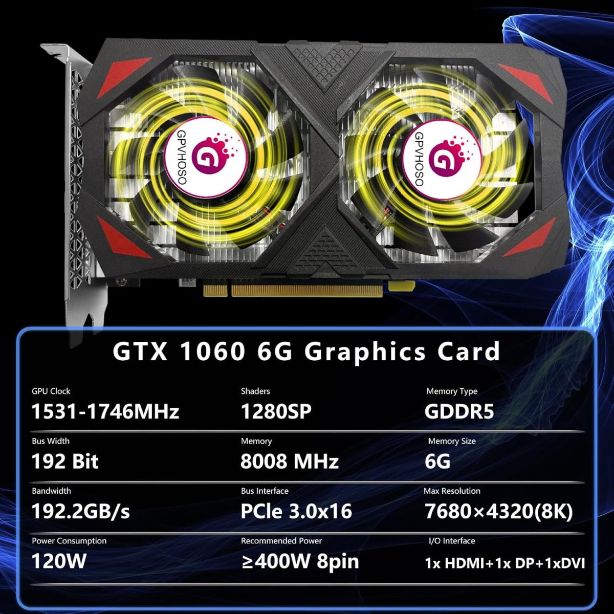 GPVHOSO GTX 1060 6GB Graphics Card GDDR5 192Bit 4K VR Ready Video Cards with Dual Cooling Fans, Support Direct X12 PCIe3.0 * 16 HDMI DVI DP, High Performance for Gaming and Creative Work
