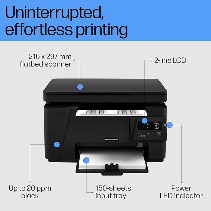 Multifunction Printer: Experience versatile functionality with the LaserJet M126A, an all-in-one printer designed for printing, copying, and scanning monochrome documents with precision. Easy-to-Use Interface: Navigate tasks effortlessly with a dual-digit numeric LED display, 7 LED indicators, and an intuitive control panel. Compatible Operating Systems: The M126A supports a wide range of operating systems, including Windows 10/8/7/Vista/XP, macOS X v10.6.8 or higher, and Linux, providing seamless compatibility. Duty Cycle: With a monthly duty cycle of up to 8000 pages, this printer is built to handle the demands of small to medium-sized offices. Warranty and Support: Backed by a 1-year unit exchange warranty, complete with easy-to-follow installation guides and customer support. The LaserJet M126A is a reliable, efficient, and user-friendly printer designed to meet the diverse needs of home and office users with ease.