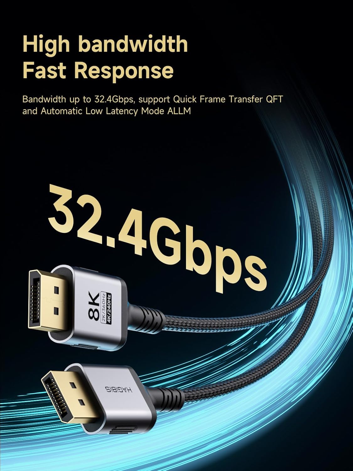 Enhanced Gaming Experience: Hagibis DisplayPort 1.4 cable provides 32.4 Gbps of bandwidth, supports high refresh rates, high resolutions, DSC and Dynamic HDR; Maximize the performance of your graphics card and monitor with no motion blur, screen tearing, or flickering