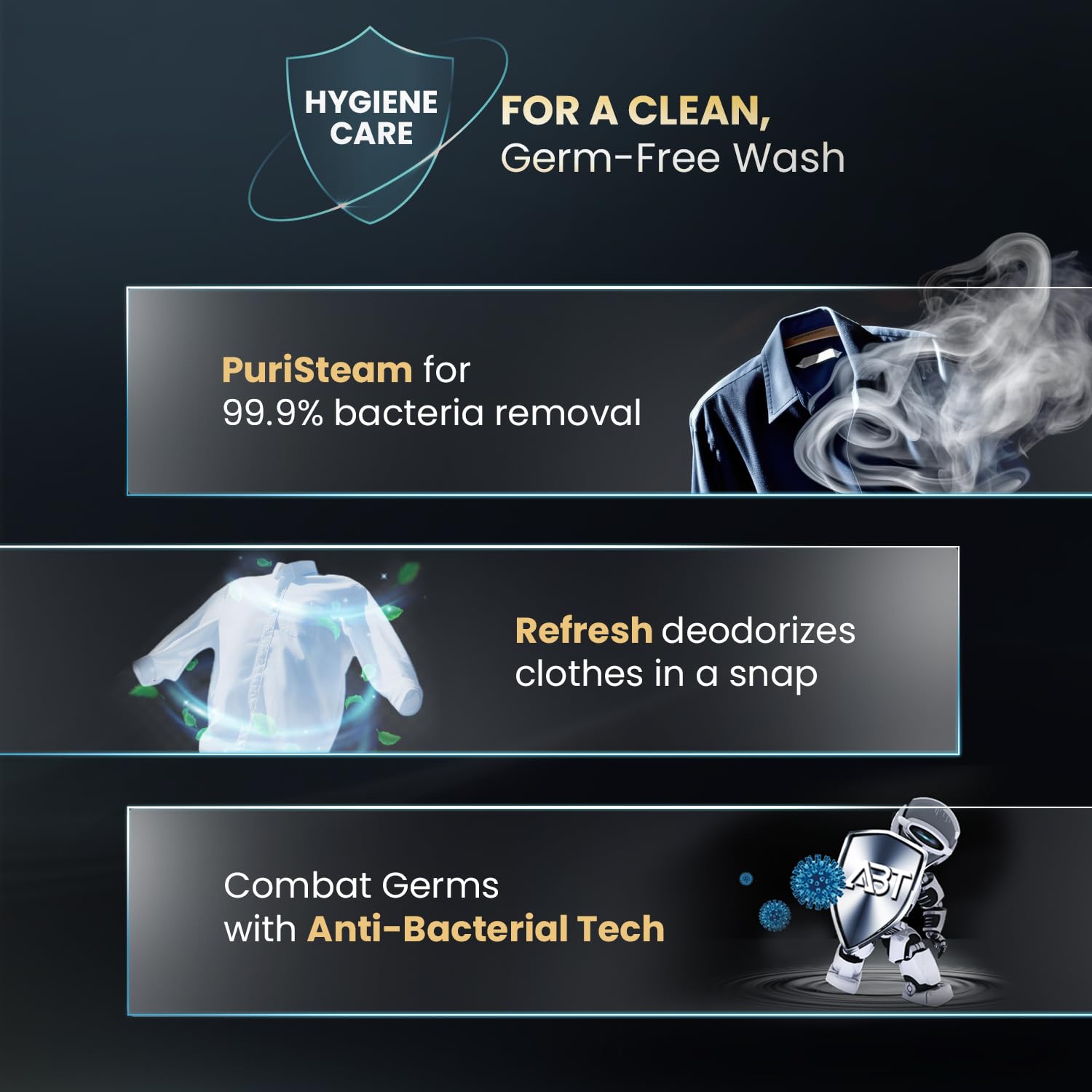 Key Performance Features: 525mm Super Drum | PuriSteam | Antibacterial Gasket & Dispenser | 15′ Quick Wash| Self Clean| Pre Wash| In-built Heater for Hot & Cold wash