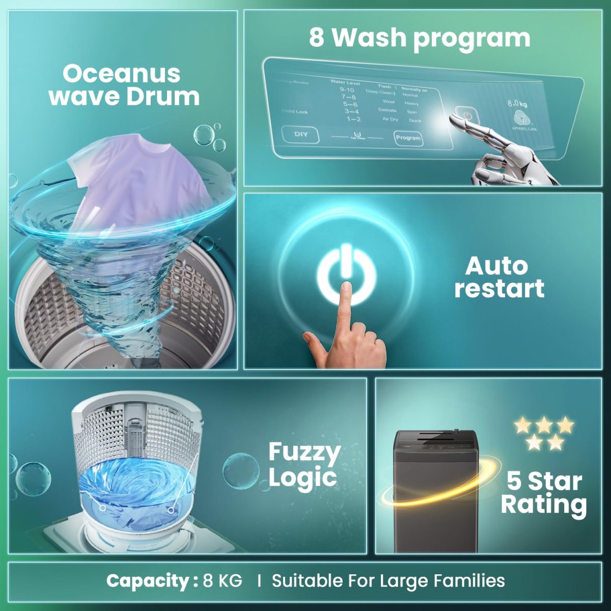 Key Performance Features: Oceanus Wave Drum : for better washing | Magic Filter : For better lint collection | Fuzzy : Auto water duction | Near Zero Pressure: 0.01MPA pressure inlet will work | Auto Restart: Memory backup