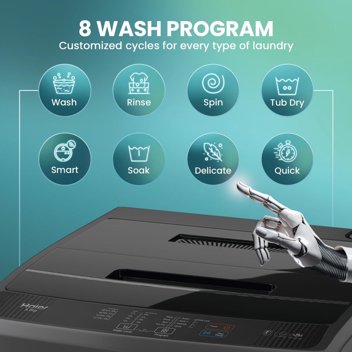 Wash Programs: 8 No.of Programs – 8 Wash programs:- 8 Wash programs:- wash/Rinse/Spin/Tub Dry/Smart/Soak/Delicate/Quick