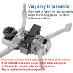【Very easy and quick to assemble】Only need to fasten the lock according to the positioning groove,no other tedious operations.Please pay attention to the installation direction of the thrower. If the installation position is incorrect,an alarm will appear on the remote controller after starting the drone.Please readjust the installation position