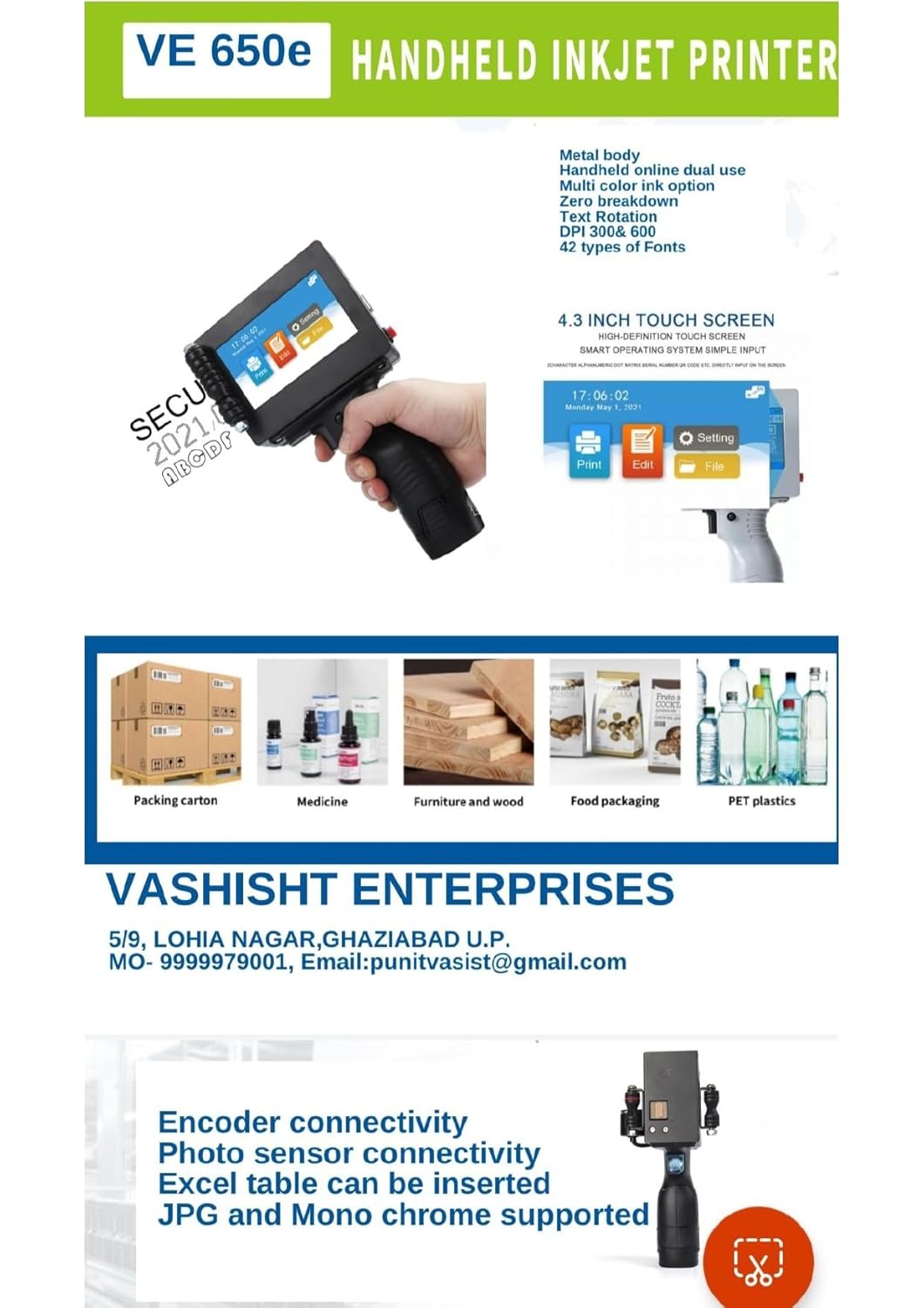 Discover the Ultimate Solution for Expiry Date Labeling with the Vashisht Enterprises Online Portable Handheld Inkjet Code Printer! Tired of struggling with manual labeling that’s time-consuming and error-prone? Say goodbye to smudged and unclear labels with our Portable Handheld Inkjet Code Printer. This innovative device is your key to efficient and precise expiry date coding, saving you time, money, and hassle. Key Features: Portable and Convenient: This handheld inkjet printer is designed with your convenience in mind. It’s lightweight, compact, and easy to use, making it a perfect on-the-go labeling solution. Expiry Date Coding: Ensure your products stay fresh and in compliance with accurate expiry date labeling. This printer delivers clear, professional results every time. Solvent Ink Cartridge: Equipped with a high-quality solvent ink cartridge, our printer ensures long-lasting and waterproof labels. Your codes will stay intact even in challenging conditions. Customizable Labels: Personalize and save frequently used labels, streamlining your labeling process. No more repetitive work – this printer does it for you. High-Resolution Printing: Enjoy crisp and legible codes with a high-resolution inkjet system, perfect for expiry dates and batch numbers. Versatile Application: Code various surfaces, from bottles to packaging materials, ensuring your products are properly labeled. Efficient and Time-Saving: With the Sonic Shop Online Portable Handheld Inkjet Code Printer, you’ll save time and resources, and your labeling will be error-free. Invest in the Sonic Shop Online Portable Handheld Inkjet Code Printer today and experience the convenience and efficiency of automated expiry date coding.