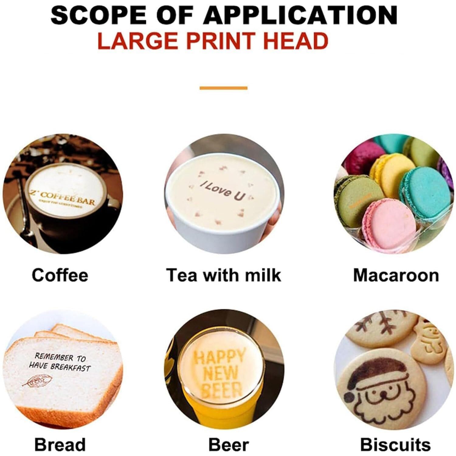 ❤【Wide Application】: It can also be overprinted on the following foods: solid type: cookies, bread, cakes, chocolate chips, rice and fried eggs that are not in direct contact with water and liquids. Liquid, milk foam latte, tahini and other thick products can be printed directly.