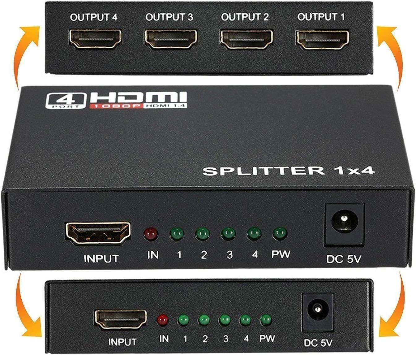【HDMI Splitter 1 In 4 Out】1×4 HDMI splitter split duplicate audio and video signal from one single Hdmi source to 4 different HDMI displays simultaneously without without lag, flash, drop in resolution.