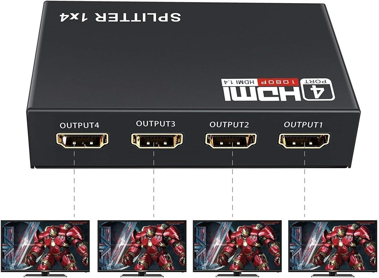 HDMI Splitter 1 in 4 Out,1×4 Hdmi Splitter Display Multiple Duplicate/Mirror Screen,Powered AC Adapter Included,Supports Ultra HD 1080P 4K/2K and 3D,for TV,Monitors,Computer,DVD,Projector