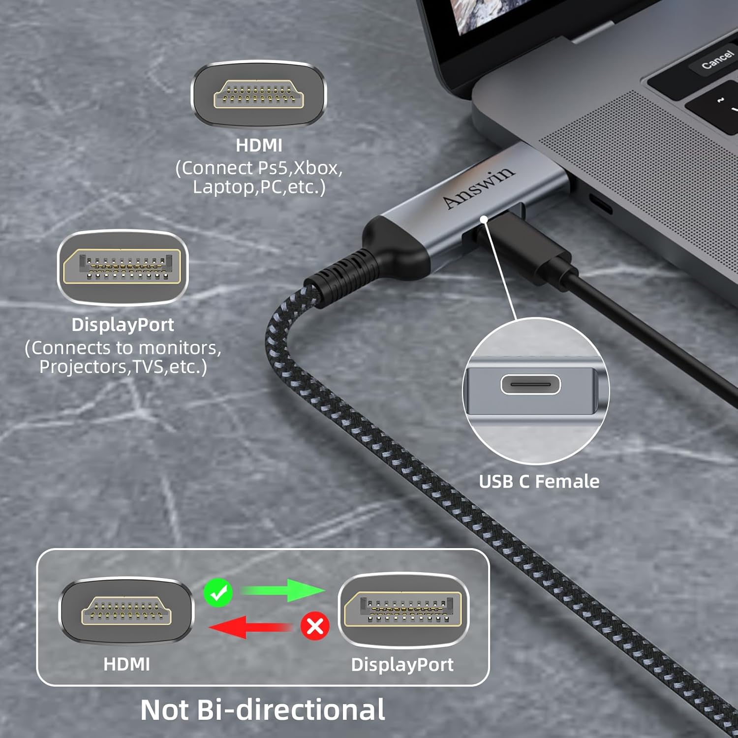 【Plug and Play】Answin HDMI Source to DisplayPort Monitor/Display cable works only from HDMI equipped desktops/laptops or other deivces(For example, Xbox,PS5 etc) to an HDTV/monitor/projector with DisplayPort (DP) output. The cable convert the HDMI 2.0b signal to DisplayPort 1.4 signal, please pay attention, ❗it’s uni-directional, from HDMI source to DisplayPort monitor or display devices.
