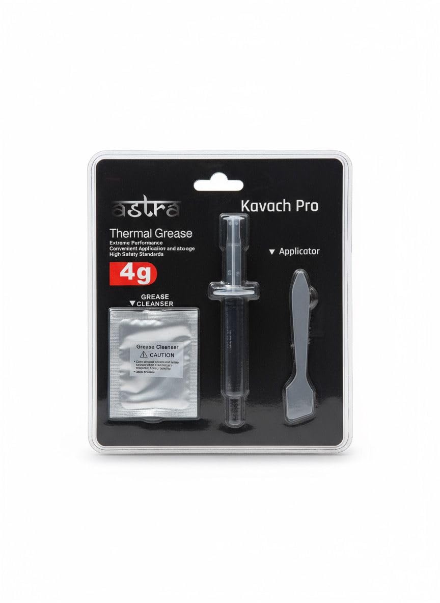 Elevate your system’s thermal performance with Astra Kavach High-Performance Thermal Paste. This premium 4g thermal compound boasts an impressive thermal conductivity of 12.8 W/m*K, ensuring efficient heat transfer between your CPU/GPU and cooling solution. The non-conductive formula eliminates any risk of electrical shorts, making it safe for application on various electronic components. Perfect for multiple applications including desktop PCs, gaming consoles like PS4 and Xbox, this thermal paste helps maintain optimal operating temperatures. The precise 4g quantity is sufficient for several applications, whilst the convenient packaging ensures easy storage and application. Backed by a 1-year warranty, this thermal solution from Astra Kavach Extreme promises reliable performance for your computing needs.