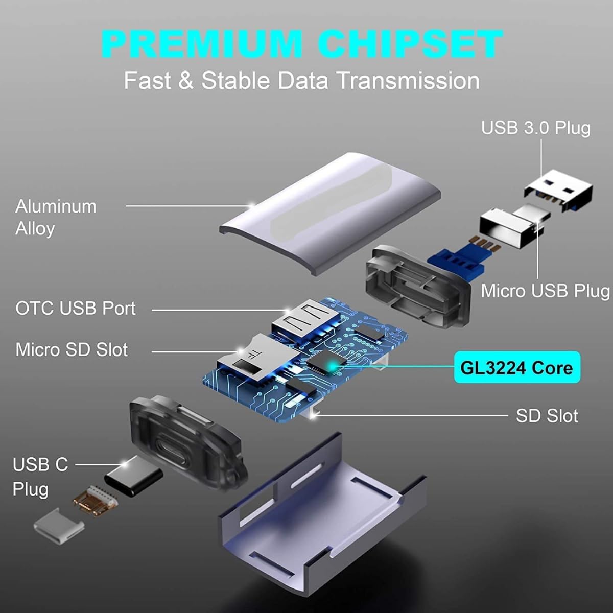 3-in-1 OTG Hub Design: Features Type-C, USB, and Micro USB ports for compatibility with Android, Windows, and macOS devices.