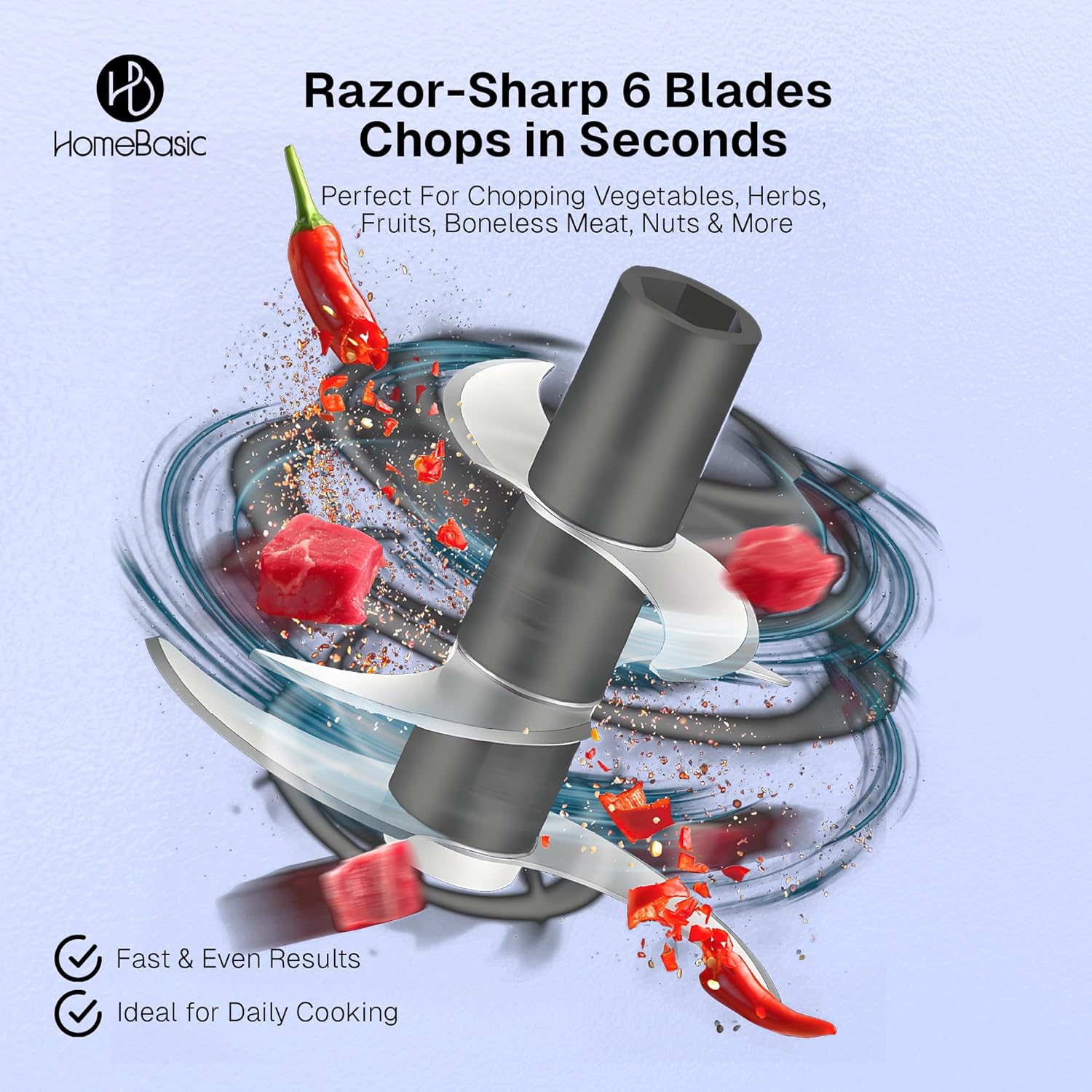 Fast & Uniform Chopping Performance: The powerful 6-leaf stainless steel blades work in triple layers to deliver consistent results in seconds. From onions to ginger, nuts to meats—this mini chopper handles everyday ingredients with speed and precision.