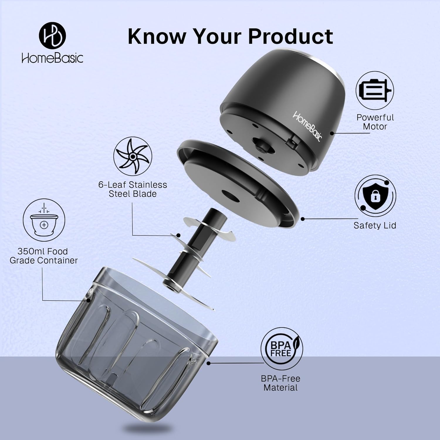 HOMEBASIC 350ml Rechargeable Electric Chopper | 6 Stainless Steel Blades | One-Touch Operation | Compact Mini Food Processor for Onion, Garlic, Ginger, Vegetables, Meat, Nuts | USB Charging​