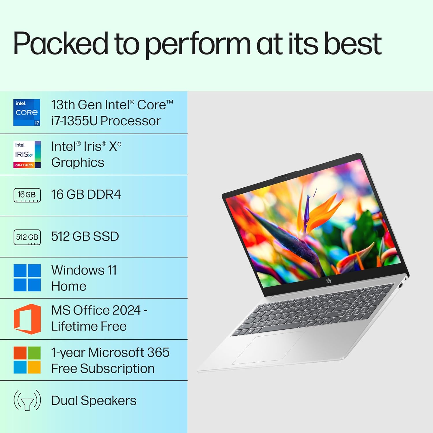 Processor, Memory & Storage: Intel Core i7-1355U (up to 5.0 GHz with Intel Turbo Boost Technology, 12 MB L3 cache, 10 cores, 12 threads) | Memory: 16 GB DDR4-3200 MT/s (2 x 8 GB) | Storage: 512 GB P PCIe Gen4 NVMe M.2 SSD