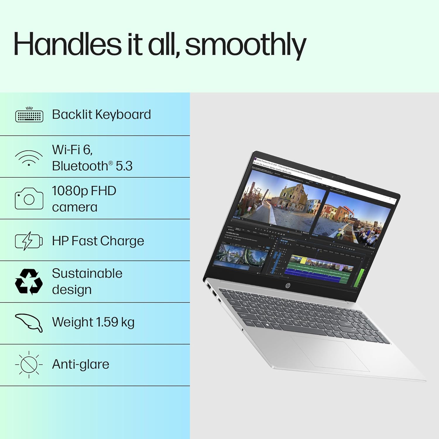 Other Features: Camera: HP True Vision 1080p FHD camera with temporal noise reduction and Integrated dual array digital microphones| Keyboard:Full-size, backlit, soft grey keyboard with numeric keypad| Audio: Dual speakers|Battery type: 3-cell, 41 Wh Li-ion polymer; Supports battery fast charge: approximately 50% in 45 minutes