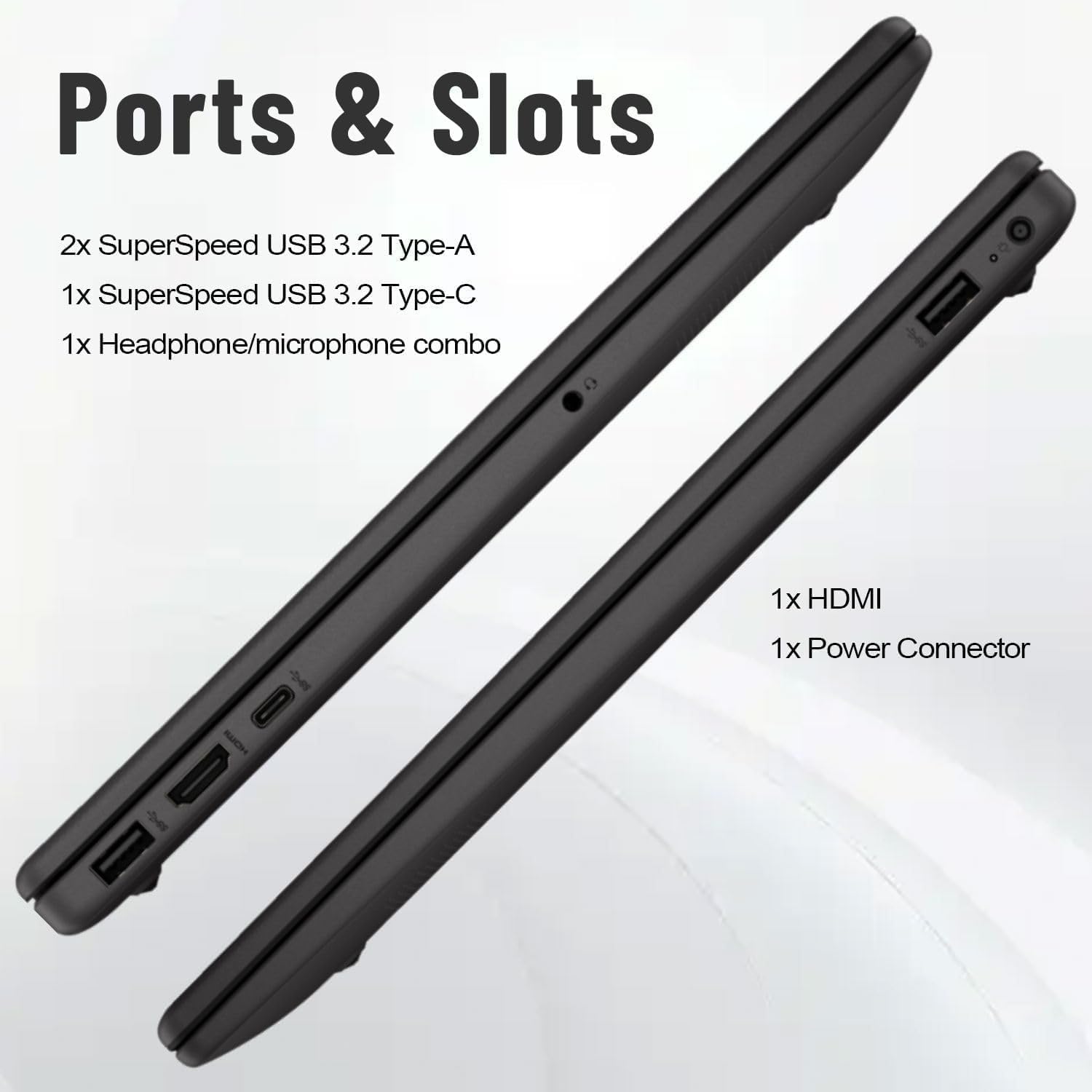 Ports : 1 USB Type-C 5Gbps signaling rate; 2 USB Type-A 5Gbps signaling rate; 1 AC power; 1 HDMI 1.4b; 1 stereo headphone/microphone combo jack