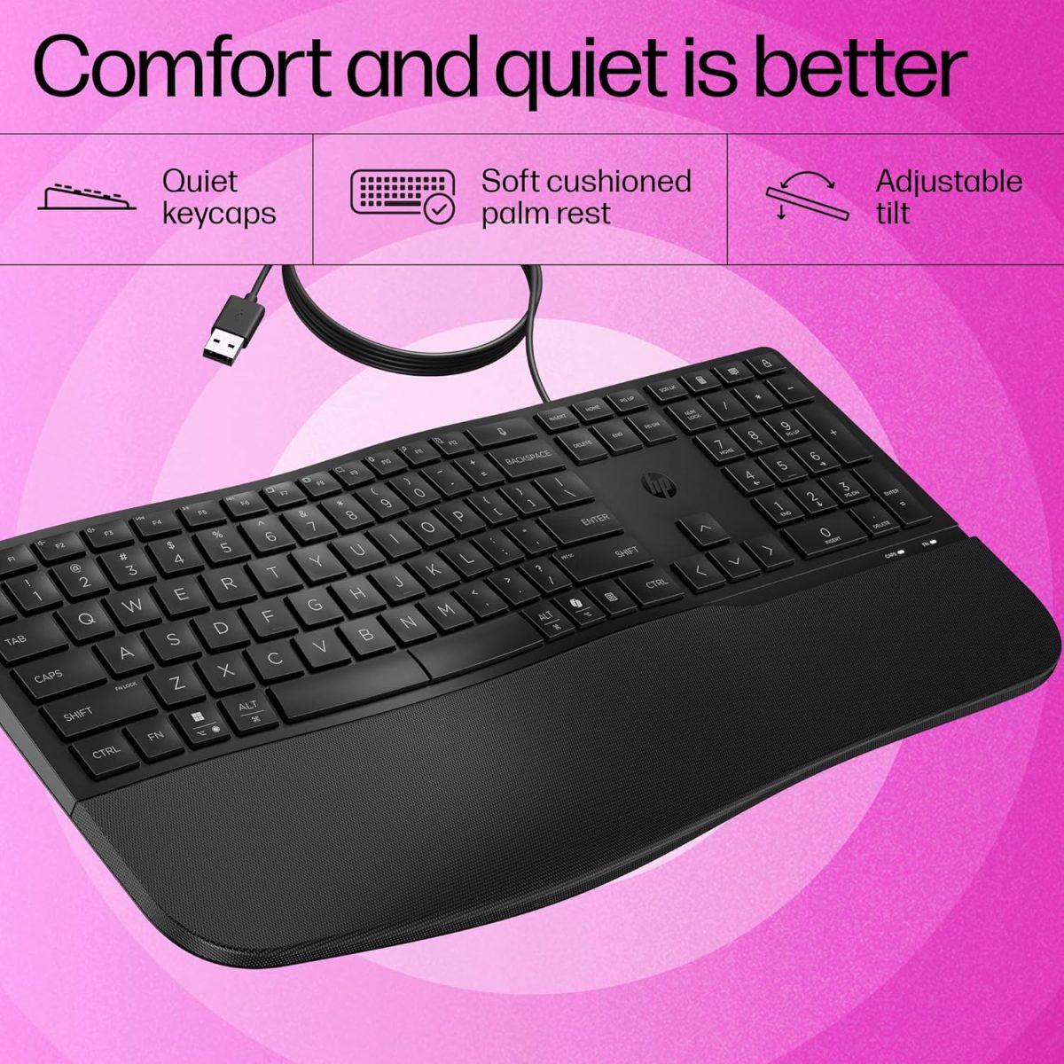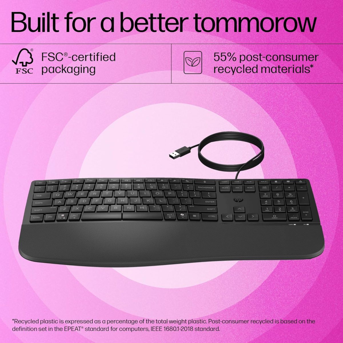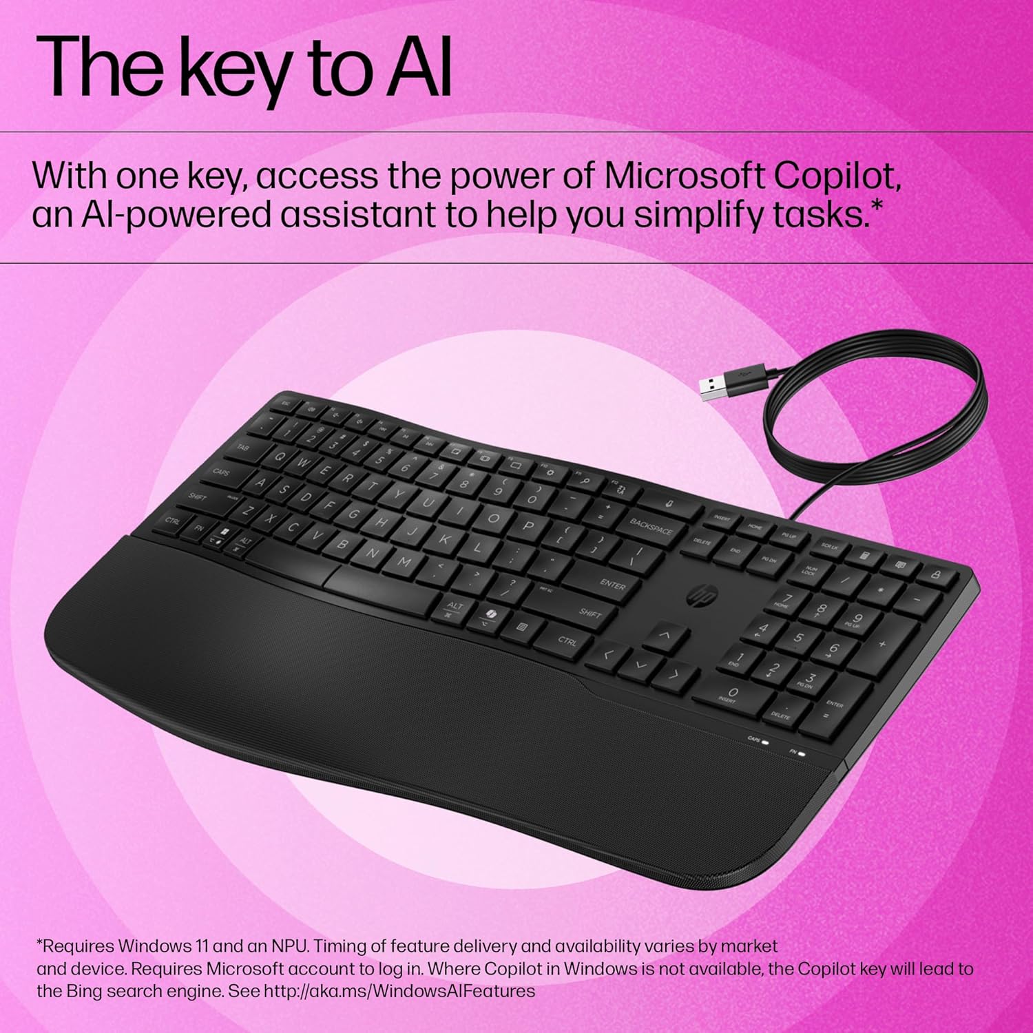 HP 480 Comfort Wired Keyboard, USB-A connectivity, 23 programmable Keys, Microsoft Copilot, Cushioned Palm Rest, Adjustable tilt, Spill Resistant, 1-Year Limited Warranty, Black, 8T6M1AA