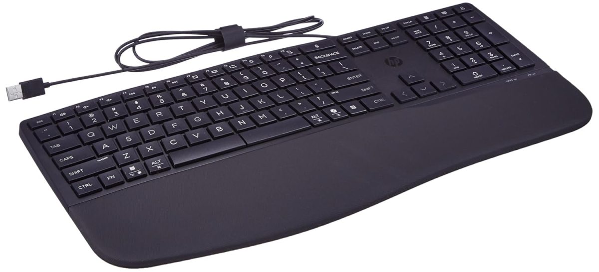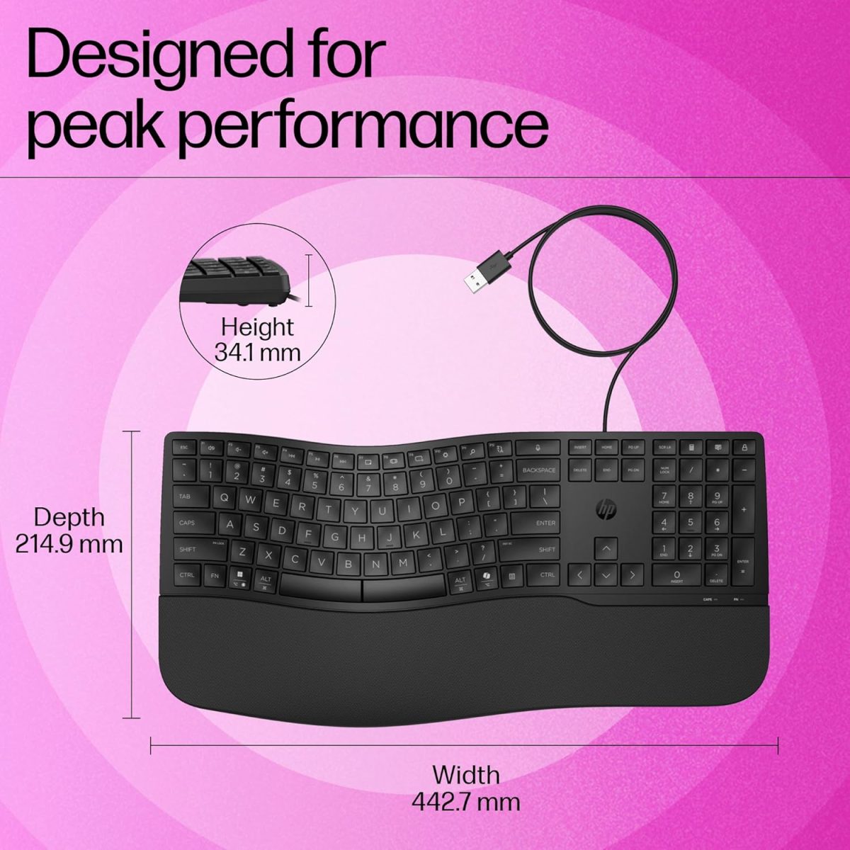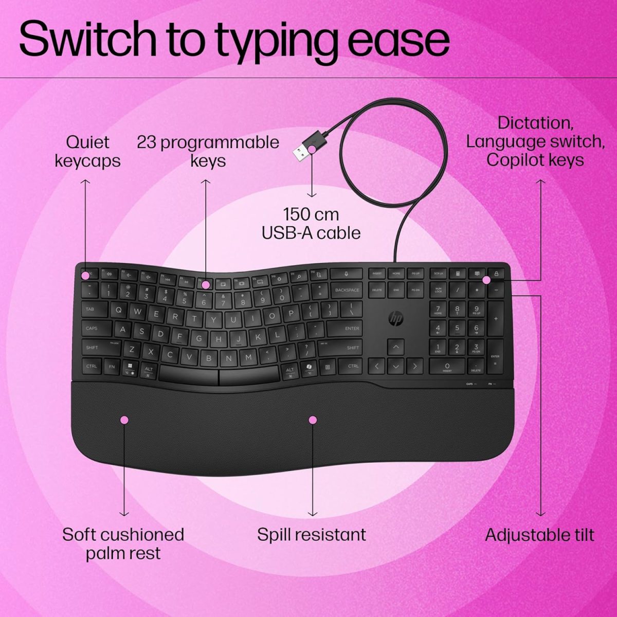 HP 480 Comfort Wired Keyboard, USB-A connectivity, 23 programmable Keys, Microsoft Copilot, Cushioned Palm Rest, Adjustable tilt, Spill Resistant, 1-Year Limited Warranty, Black, 8T6M1AA