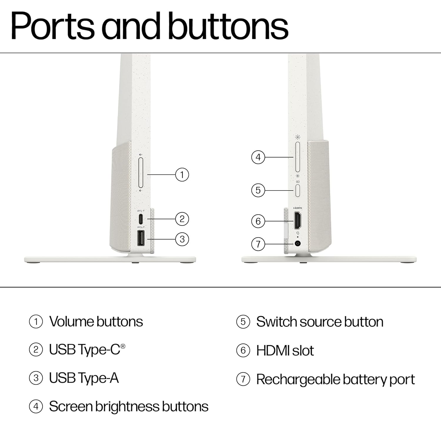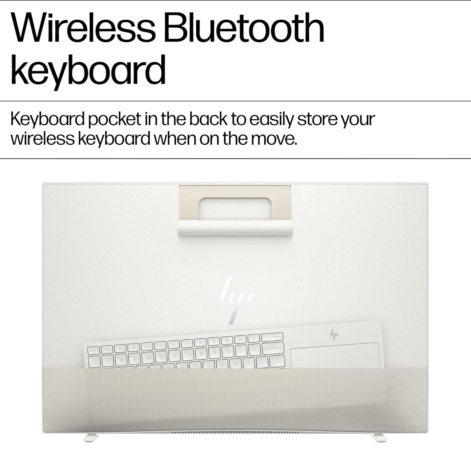 Features: touch screen; three-sided micro-edge; HP 720 White Touchpad Integrated Bluetooth Keyboard; IR; Wi-Fi 6E; 1 USB Type-A 10Gbps signaling rate; 1 USB Type-C 10Gbps signaling rate (DisplayPort 1.4a); 55% post-consumer recycled plastic; Ocean-bound plastic in speaker enclosure(s); 100% recycled polyester in speaker and pocket fabric; 45% recycled metal