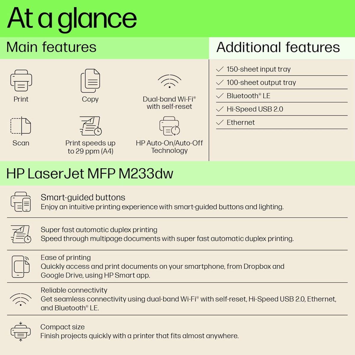 HP Laserjet MFP M233dw Printer, Wireless, Print, Copy, Scan, Hi-Speed USB 2.0, Ethernet, Bluetooth LE, Up to 30 ppm, 150-sheet Input Tray, Auto Duplex Printing, Black and White, 6GX04A