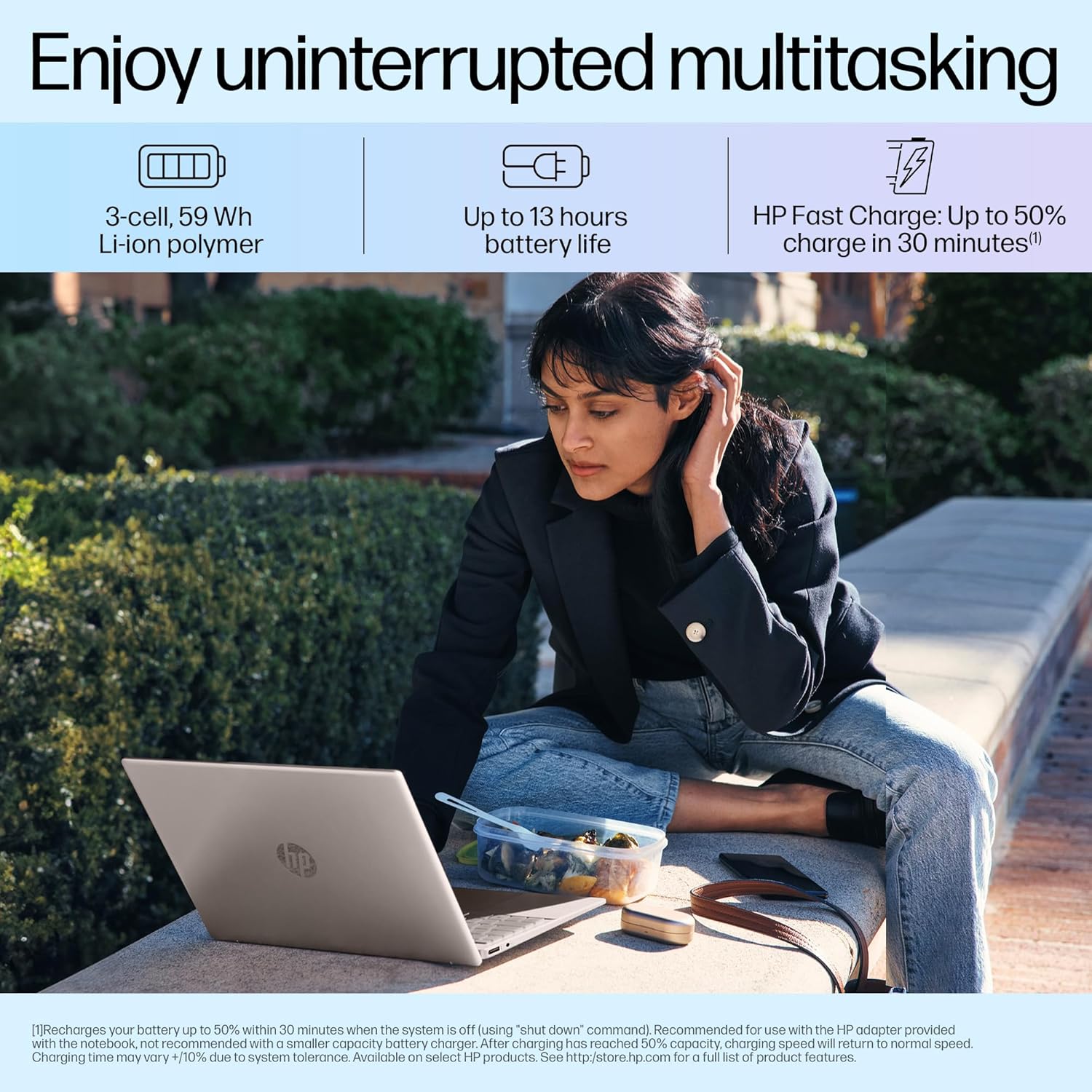 【Long battery life】Go all day long with the 3-cell, 59 Wh Li-ion polymer battery that keeps you powered for up to 13 hours. No time to pause and wait? Charge your device up to 50% in 30 mins