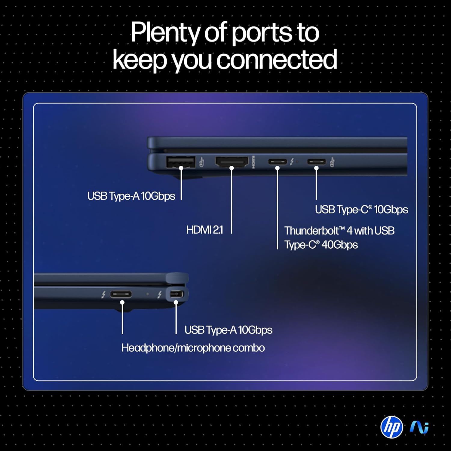 Ports & Connectivity : 2 USB Type-A 10Gbps signaling rate; 1 HDMI 2.1; 1 headphone/microphone combo; 1 Thunderbolt 4 with USB Type-C 40Gbps signaling rate (USB Power Delivery, DisplayPort 2.1, HP Sleep and Charge); 1 USB Type-C 10Gbps signaling rate (USB Power Delivery, DisplayPort 1.4a, HP Sleep and Charge)| Connectivity: Intel Wi-Fi 7 BE201 (2×2) and Bluetooth 5.4 wireless card