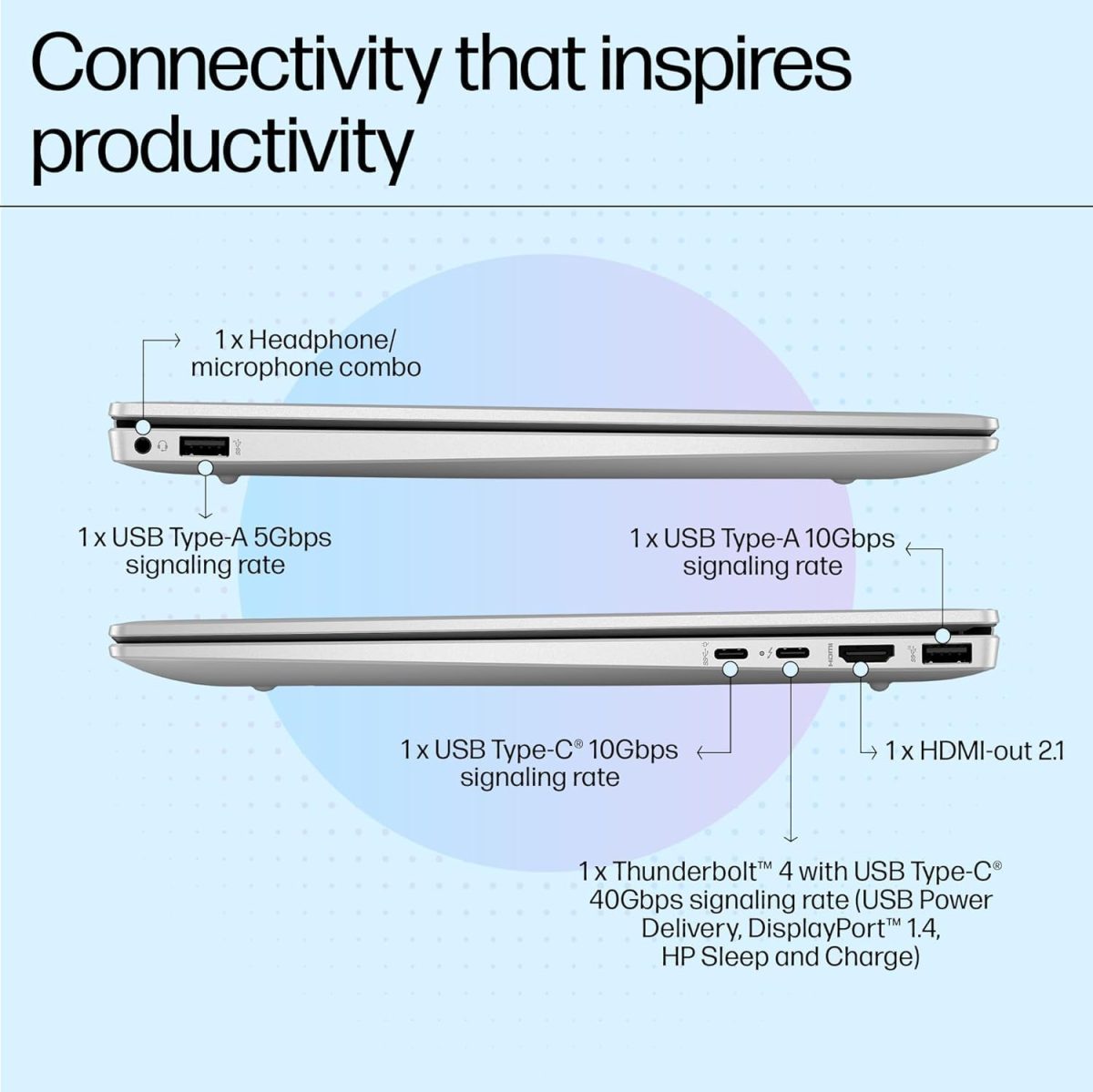 Ports – 1 Thunderbolt 4 with USB Type-C 40Gbps signaling rate (USB Power Delivery, DisplayPort 1.4, HP Sleep and Charge); 1 USB Type-C 10Gbps signaling rate (USB Power Delivery, DisplayPort 1.4, HP Sleep and Charge); 1 USB Type-A 10Gbps signaling rate; 1 USB Type-A 5Gbps signaling rate; 1 HDMI-out 2.1; 1 headphone/microphone combo