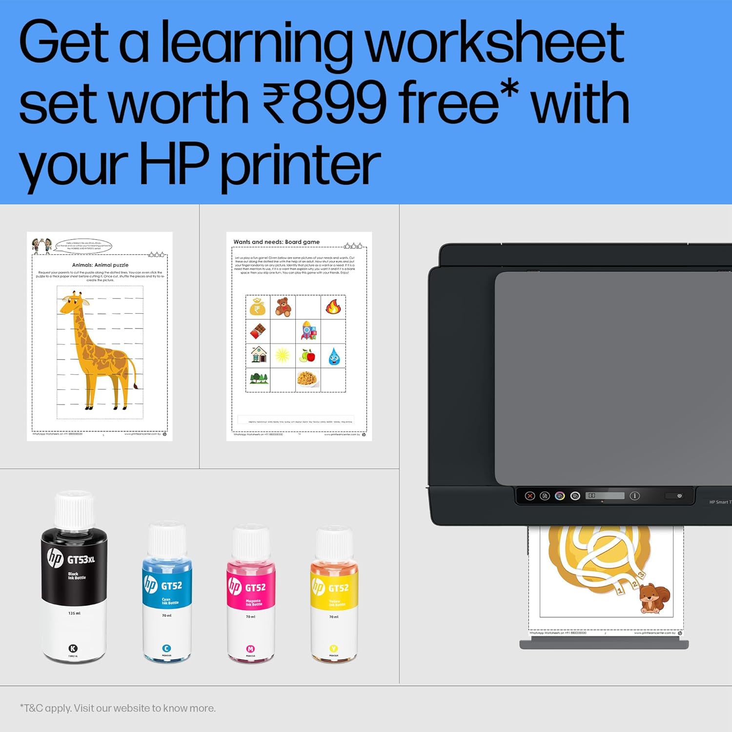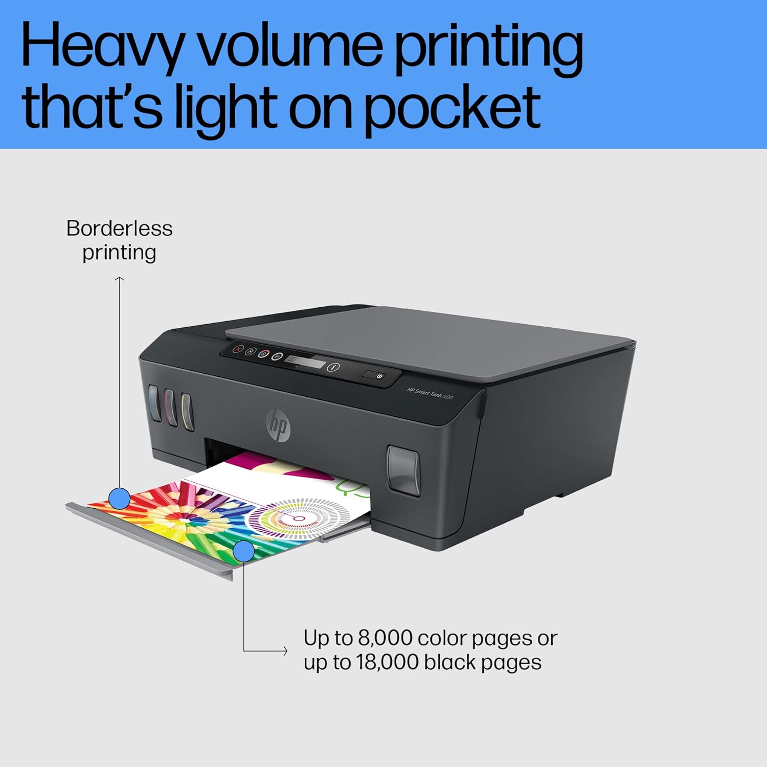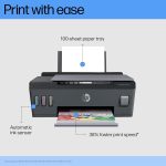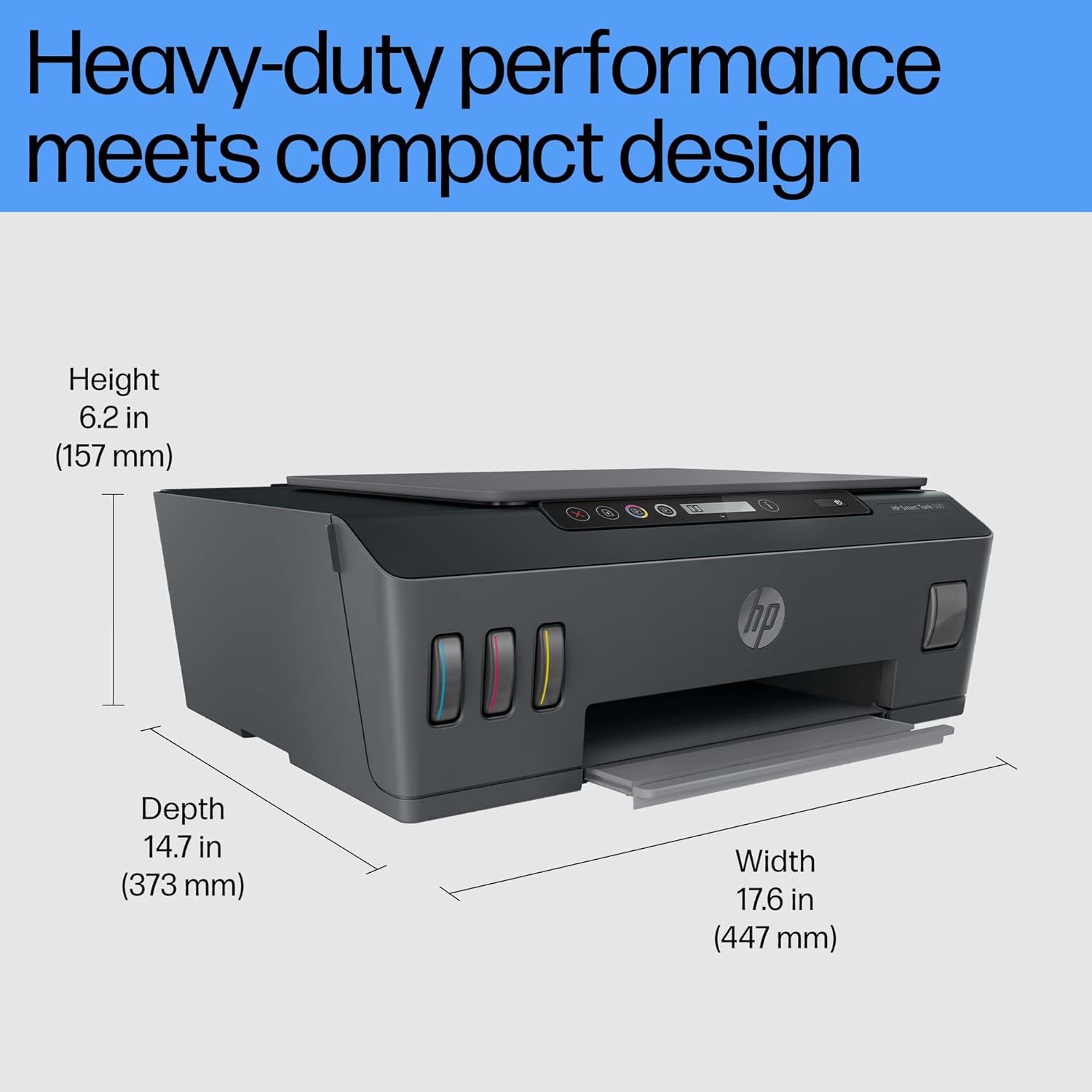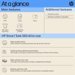 HP Smart Tank 500 AiO ink tank printing with all-in-one versatility. Printer type: ink Tank; functionality: All-in-One (print, scan, copy), scanner type – flatbed; output color. Count on the outstanding print quality you expect from HP – get stunning quality time after time. Text is sharp. Graphics are vibrant. Count on dark, crisp text, and get vibrant color graphics for all your prints. With integrated ink tanks and an automatic ink sensor, you get a compact, spill-free refill system that makes it easy to manage ink.[9] Perfect for low-cost, high-volume printing – up to 8000 color pages or up to 6000 black pages.[4] Easily monitor and maintain ink levels with an integrated tank design and an automatic ink sensor. A4 Color Inkjet All-in-One Printer, Perfect for Home Print, Copy and Scan Print speed up to 11 ppm (black) and 5 ppm (color) USB