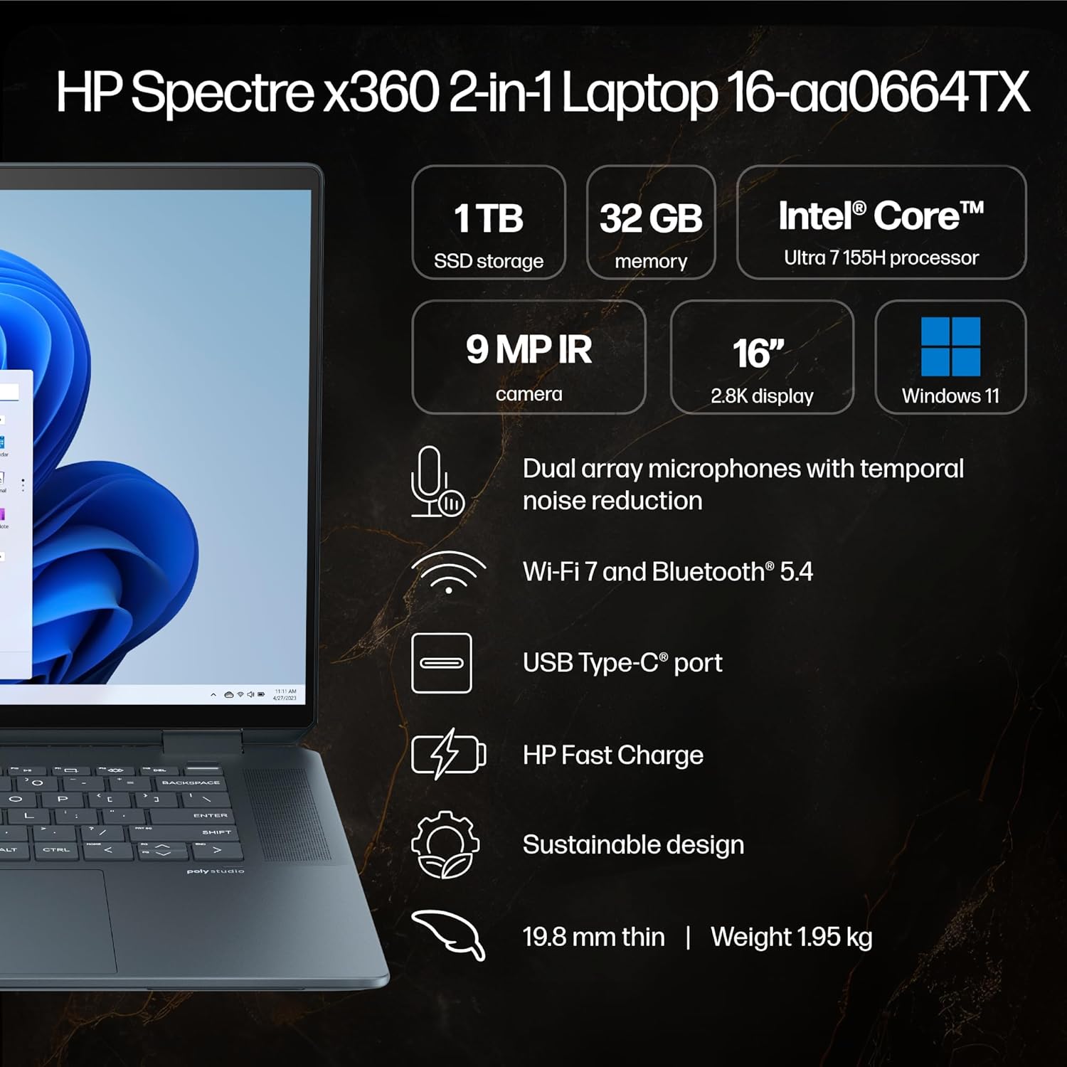 HP Spectre x360 AI Laptop, Intel Core Ultra 7 155H, 12 TOPS, 32GB LPDDR5x, 1TB SSD (Win11, Office21, Blue, 1.9kg), Touchscreen, 2.8K, OLED, 16-inch(40.6cm), Intel Arc graphics, 9MP IR camera, aa0664TX