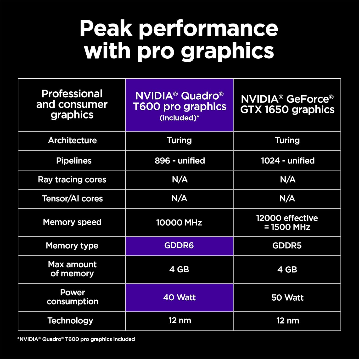 Display & Graphics : 39.6 cm (15.6″) diagonal, FHD (1920 x 1080), IPS, narrow bezel, anti-glare,250 nits, 45% NTSC|Graphics: NVIDIA Quadro T600 (4 GB GDDR6 dedicated)