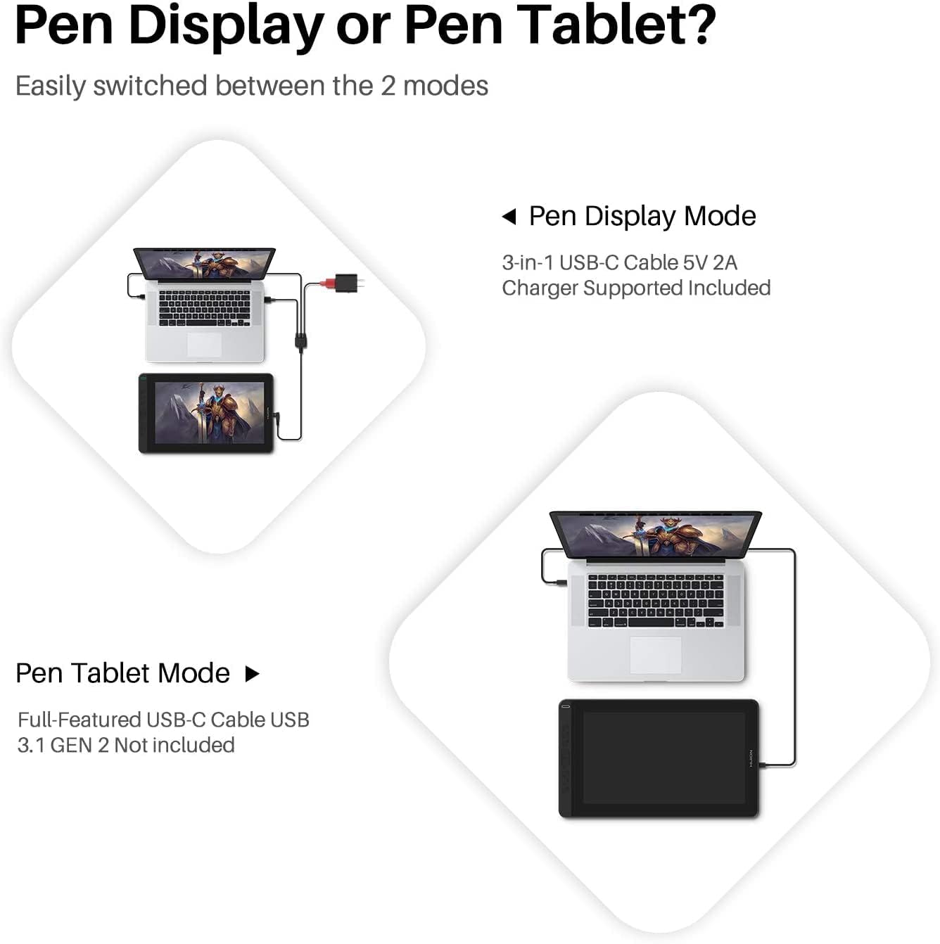 Kamvas 13 comes with 2 Type-C ports.The upper port is for a 3in1 Type-C to HDMI connection while the lower port is for a full-featured Type-C to Type-C single cable connection(sold separately).It can be powered directly by a laptop that runs on 5 volts or above via the USB cable while no extra power supply is needed. It is not having the battery just plug in and play device.
