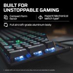 HyperX mechanical switches1 Full aircraft-grade aluminum body Compact, portable design with detachable USB Type-C cable Dazzling RGB lighting with dynamic effects Advanced customization with HyperX NGENUITY software Three adjustable keyboard angles Onboard memory for three profiles Game Mode, 100% anti-ghosting, and N-key rollover functionalities